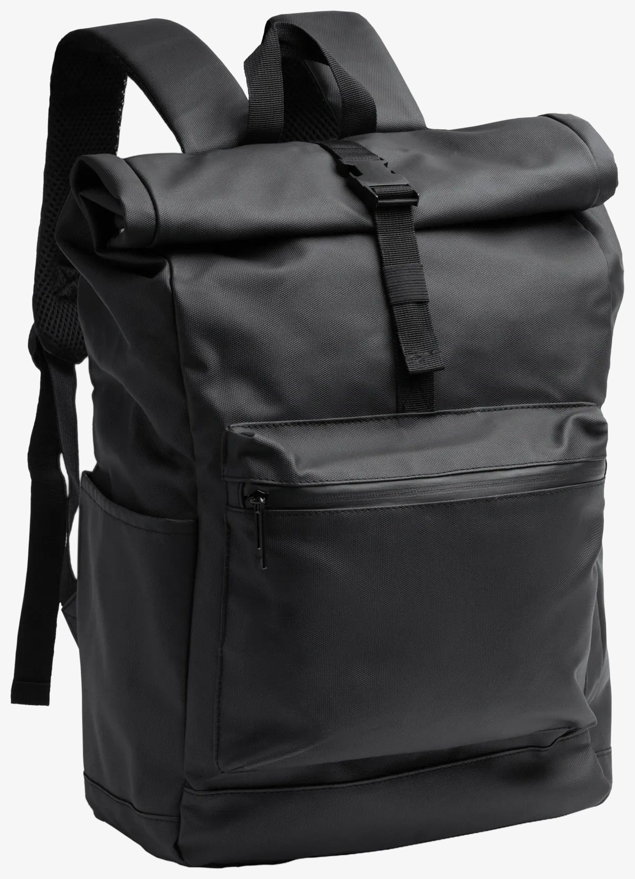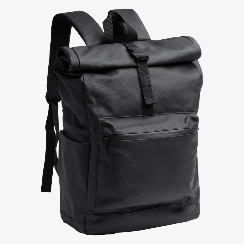 A mochila de couro PU inclui um grande compartimento principal com abertura extensível e botões de pressão laterais para fechamento. Possui bolso interno acolchoado 18 polegadas, bolso externo frontal com fecho de correr impermeável e dois bolsos laterais. Uma alça para carrinho está integrada para facilitar o transporte.