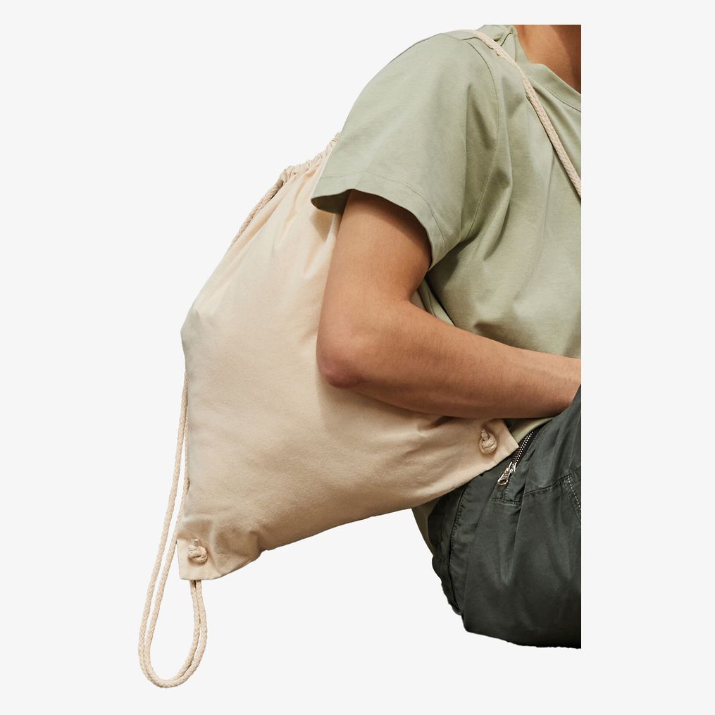 A bolsa gym em algodão reciclado é concebida para uso comum com uma capacidade de 12 L e dimensões de 37 x 46 cm. É fabricada em 100% algodão reciclado.