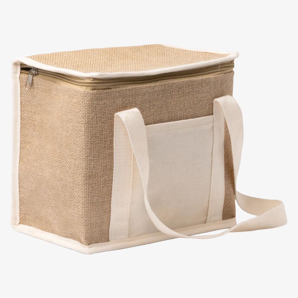 A bolsa isotérmica FLORIT é feita de juta com um bolso frontal em algodão. Inclui um compartimento principal forrado com acabamento em alumínio para isolamento térmico. Alças em algodão incluídas.