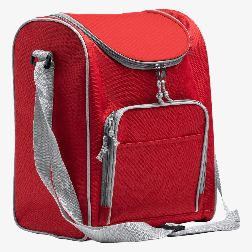 A bolsa isotérmica em poliéster 600 D inclui um bolso principal isotérmico e um bolso frontal prático para arrumação. A alça de transporte é ajustável para uso adequado.