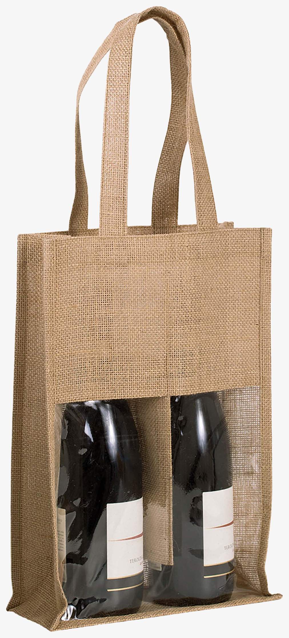A bolsa para garrafas é feita em tela de juta com duas alças e uma janela transparente na frente. Permite o transporte de duas garrafas.