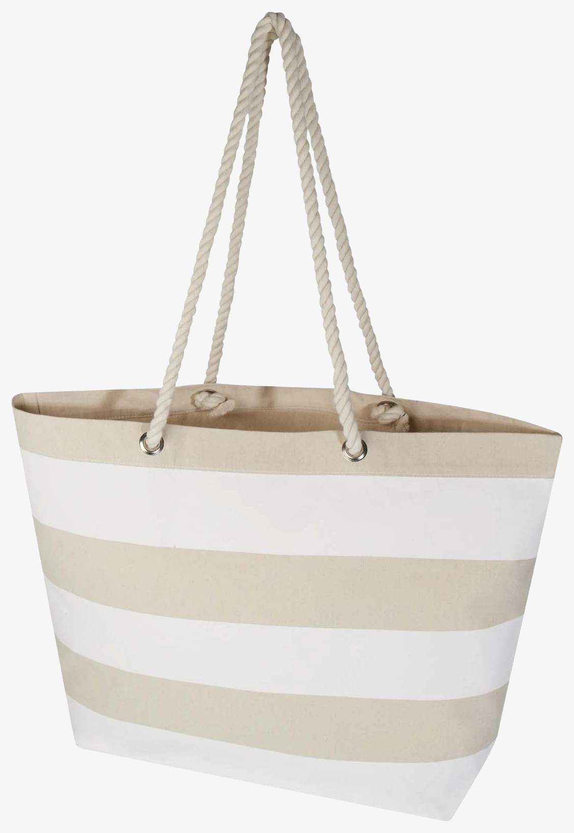 A bolsa tote praia Florida é em algodão 100% reciclado. Possui capacidade de 18 litros e alças de corda adequadas para transportar objetos pesados no compartimento principal. A densidade do algodão garante robustez duradoura.