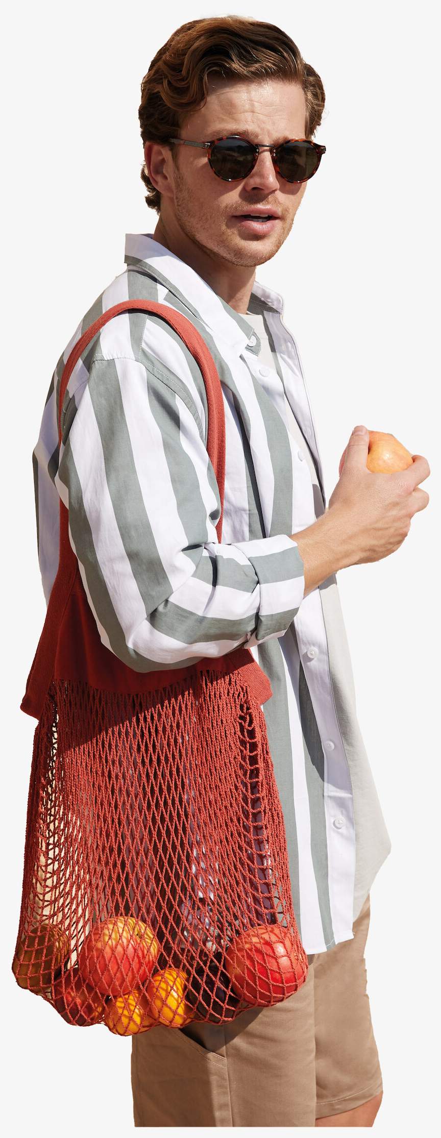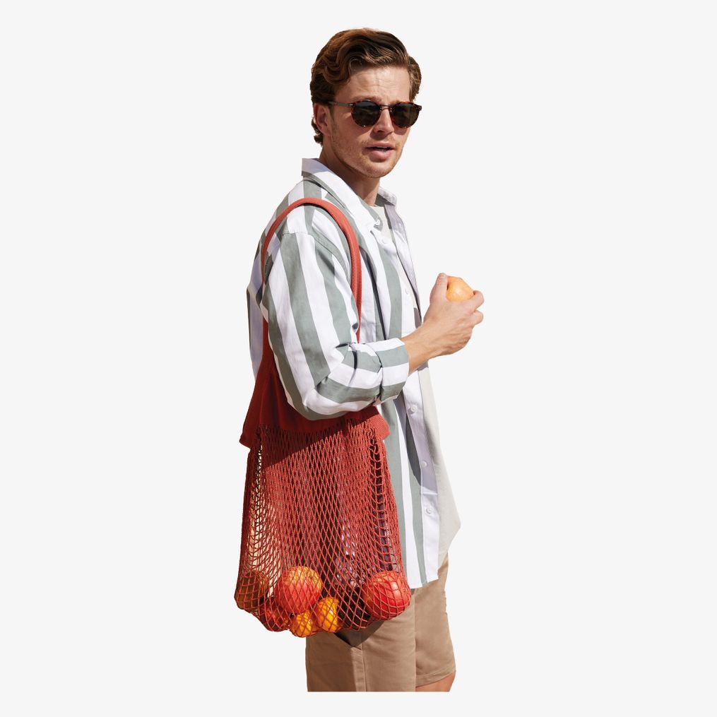 A rede de compras em algodão orgânico pode ser usada na mão ou no ombro. Pode conter até 6 kg, com capacidade de 10 L. Suas dimensões são 38 x 41 cm e o comprimento das alças é 61 cm.