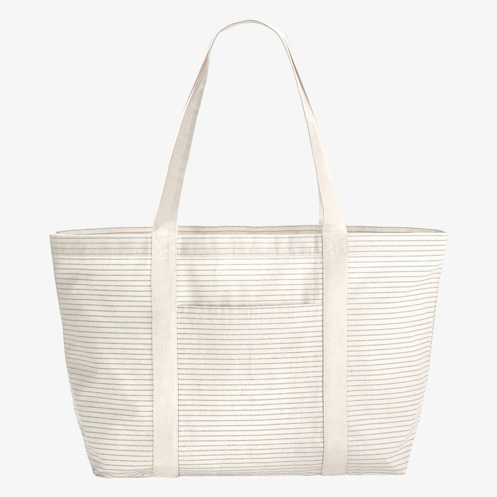 A sacola listrada em algodão orgânico apresenta um tamanho prático para transportar objetos pessoais e compras. Possui alças adequadas para transporte na mão ou no ombro, oferecendo uso versátil.