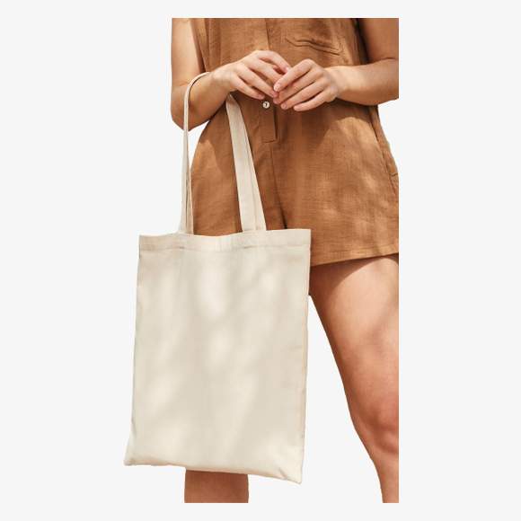 A sacola tote de algodão reciclado w901 é adequada para uso diário com capacidade de 10 L. Possui alças de 67 cm permitindo transporte na mão ou no ombro. As dimensões são 38 x 42 cm. O material é algodão reciclado.