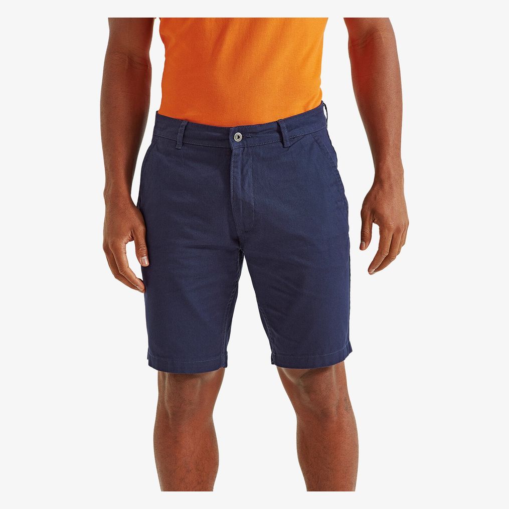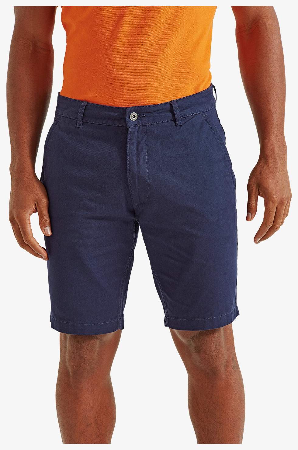 O short homme coupe classique é confeccionado em sarja de algodão. Inclui dois bolsos frontais, dois bolsos traseiros com aba e fechamento em botão, fecho de correr e botão na frente. O tecido apresenta acabamento macio.