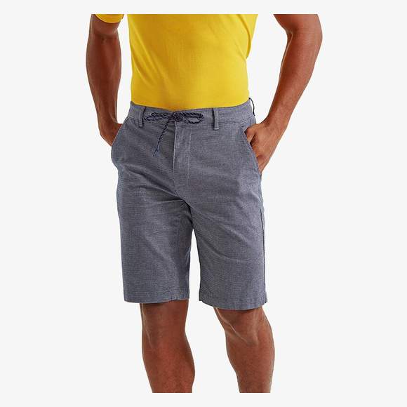 O short chino casual masculino é feito de algodão com um toque de elastano. Inclui dois bolsos frontais com aba e dois bolsos traseiros embutidos. O fechamento é por botão de pressão e zíper, acompanhado de um cordão ajustável na cintura. Passantes para cinto completam suas funcionalidades.