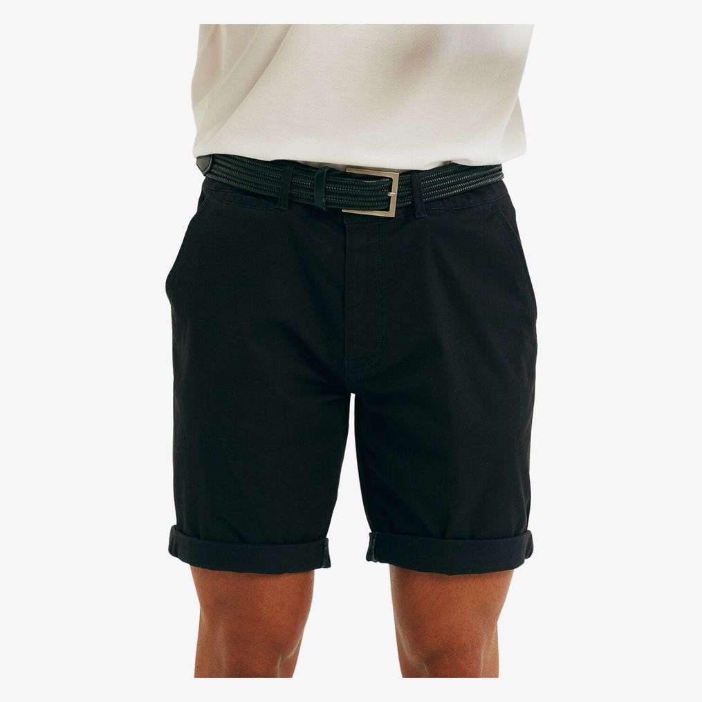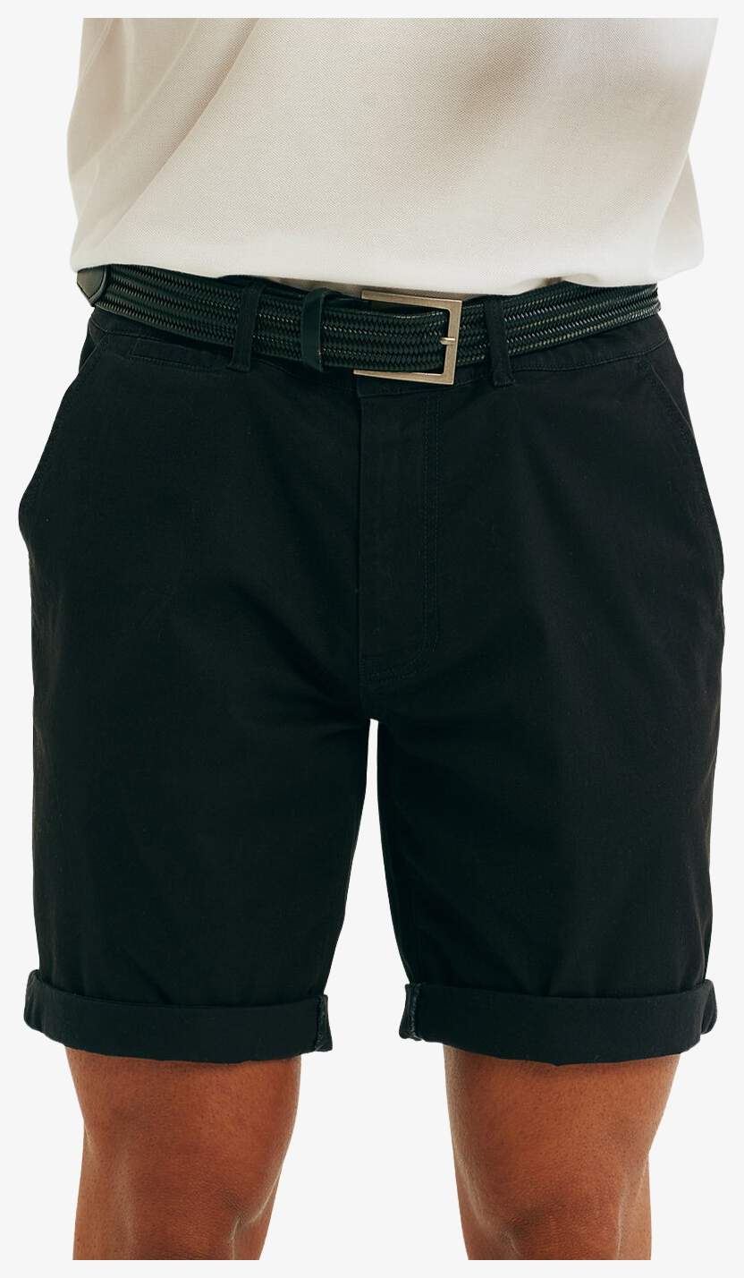 O short chino leve masculino inclui dois bolsos frontais com aba e dois bolsos traseiros embutidos. Está equipado com fecho de correr e botão de pressão na frente. O tecido é leve e macio ao toque. Passantes para cinto estão presentes. O short pode ser usado dobrado.