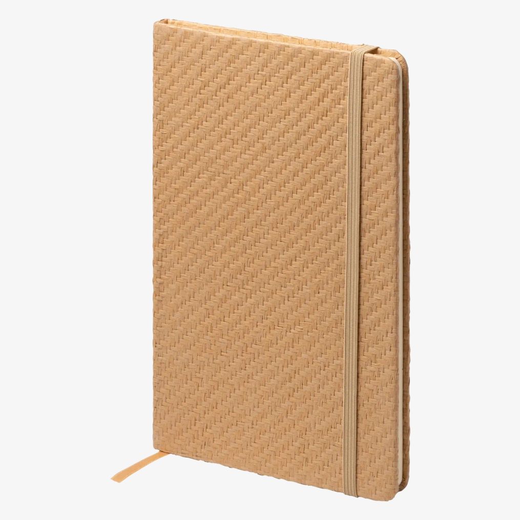 O bloco de notas A5 possui capa dura em palha natural, marcador de página e faixa elástica. Contém 80 folhas lisas.