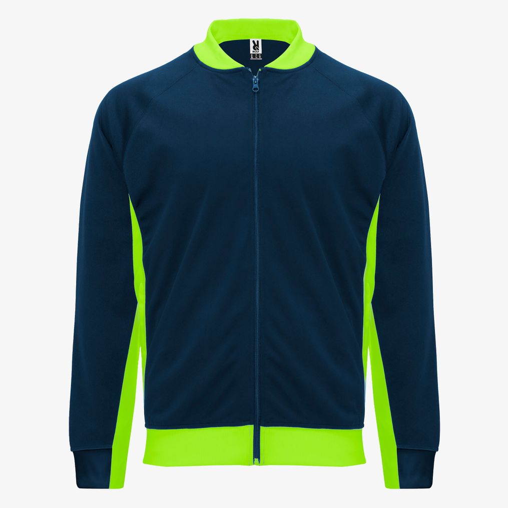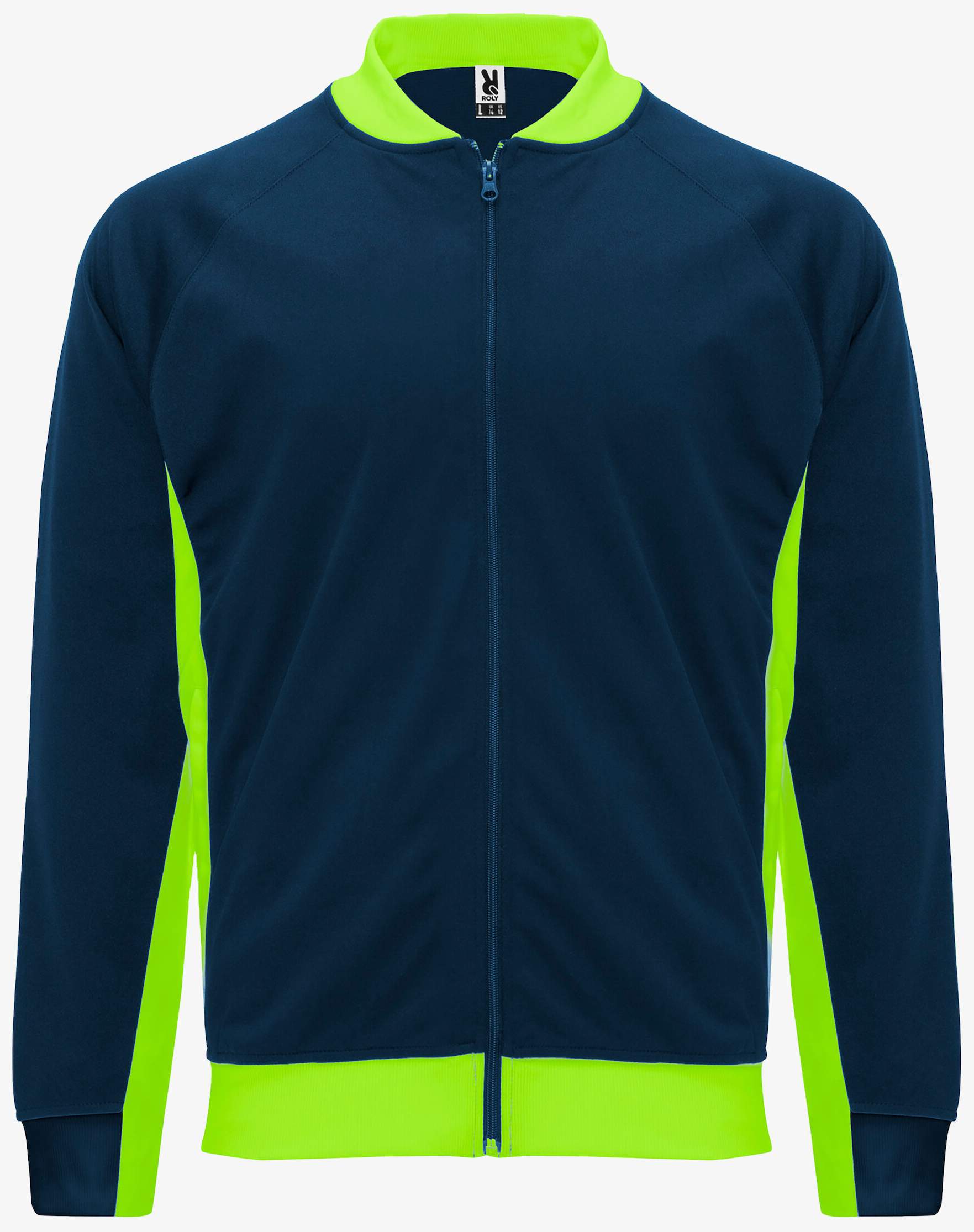 A jaqueta Iliada é concebida em poliéster com mangas raglan e painéis combinados nas laterais das mangas. Possui gola e punhos baixos canelados 2x1 contrastantes, bem como dois bolsos laterais com zíper. Forro interior em rede tom sobre tom incorporado. Etiqueta destacável incluída.