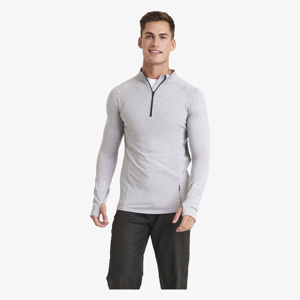 A blusa meio zíper Cool Flex Long Half-Zip Top é feita com tecido misto contendo poliéster e elastano, oferecendo elasticidade e sustentação. Apresenta corte esportivo, mangas raglan facilitando os movimentos e detalhes refletivos. O meio zíper com gola reta permite ventilação, e um protetor de queixo limita irritações.