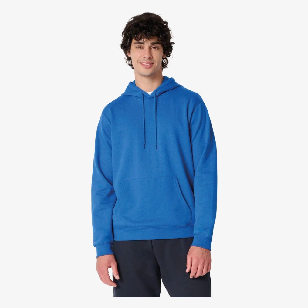 O sweat-shirt à capuche unisexe é confeccionado em moletom escovado tubular com corte reto. Possui bolso canguru e capuz forrado em malha com cordão de ajuste tom sobre tom. Acabamentos nas mangas e na barra em canelado 1x1 com costuras duplas.