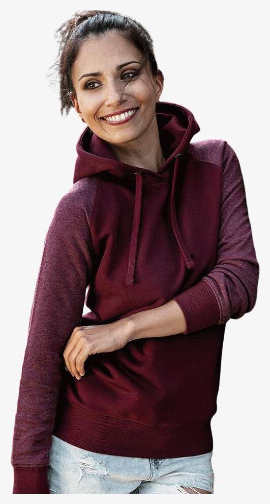 O casaco com capuz my mate - Ladies' No Pocket Hoody combina algodão ring-spun e poliéster com corte moderno e capuz de duas camadas em 3 peças. Inclui cordão plano combinado, mangas raglan e pequeno bolso canguru. Construção com costuras laterais e malha canelada 2x1 nas extremidades.