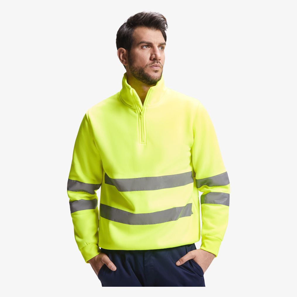 O sweat de alta visibilidade Spica possui fecho éclair, gola alta com protetor de queixo e cursor. Inclui duas faixas refletoras horizontais no peito e nas mangas, bem como uma faixa de reforço na parte interna do pescoço. A malha canelada 1x1 equipa os punhos inferiores.
