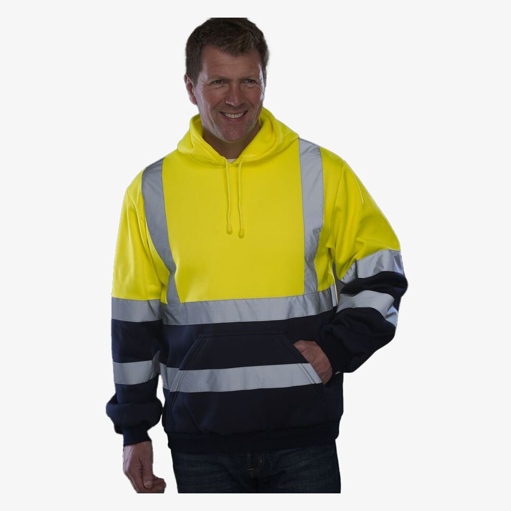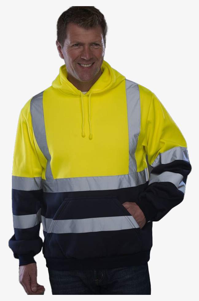 O sweatshirt com capuz em poliéster hvk05 é fabricado com duas faixas refletoras de 5 cm ao redor do corpo e dos braços, além de uma tira refletora em cada ombro. O capuz anexado é equipado com cordão para ajuste. Possui um bolso canguru na frente, mangas montadas e punhos canelados nas mangas e na barra da peça.