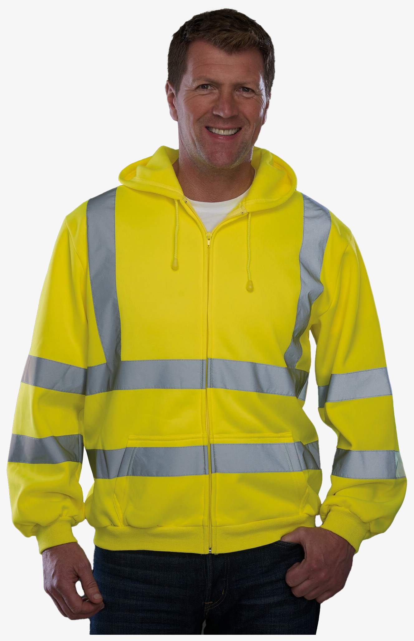 O sweat-shirt zippé capuche inclui um capuz fixo com cordão de ajuste e um fecho éclair frontal em toda a extensão. Duas fitas refletoras de 5 cm de largura circundam o corpo e os braços, com uma em cada ombro. Os punhos são canelados e as costuras duplas em toda a peça.