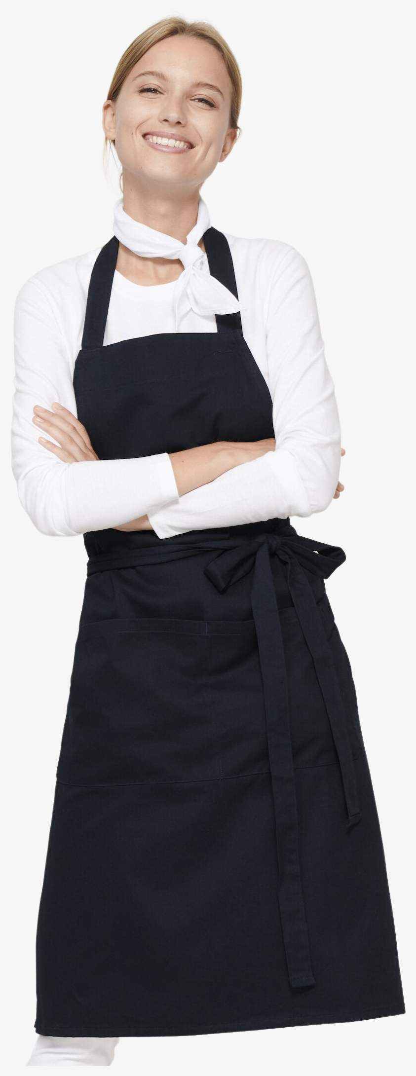 O avental longo em algodão orgânico possui um grande bolso frontal dividido em dois compartimentos. É ajustável na gola por meio de uma casa de botão.