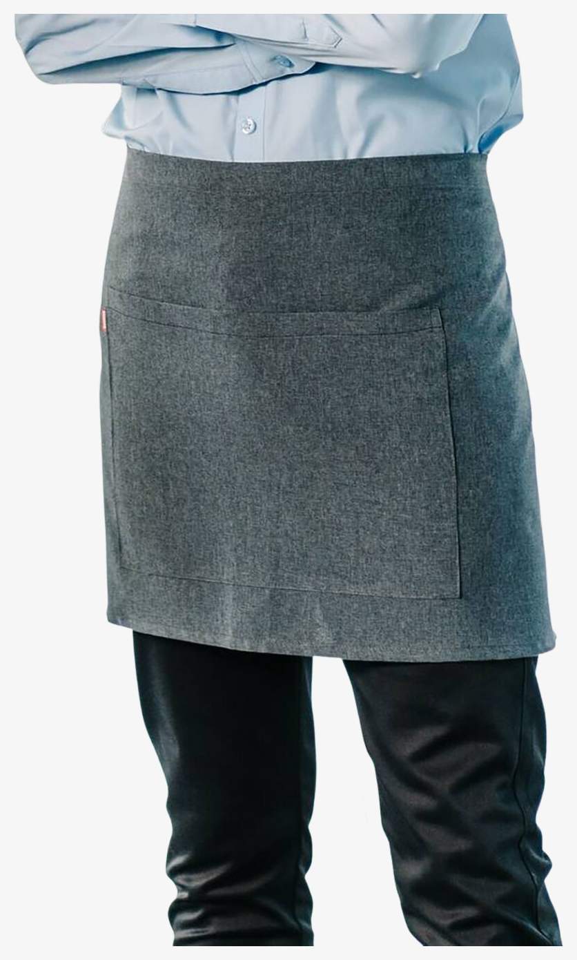 O tablier court é confeccionado em poliéster e algodão, equipado com dois laços nas extremidades para ajuste. Inclui quatro bolsos, um deles com quatro compartimentos adequados para caneta e caderno PDA.