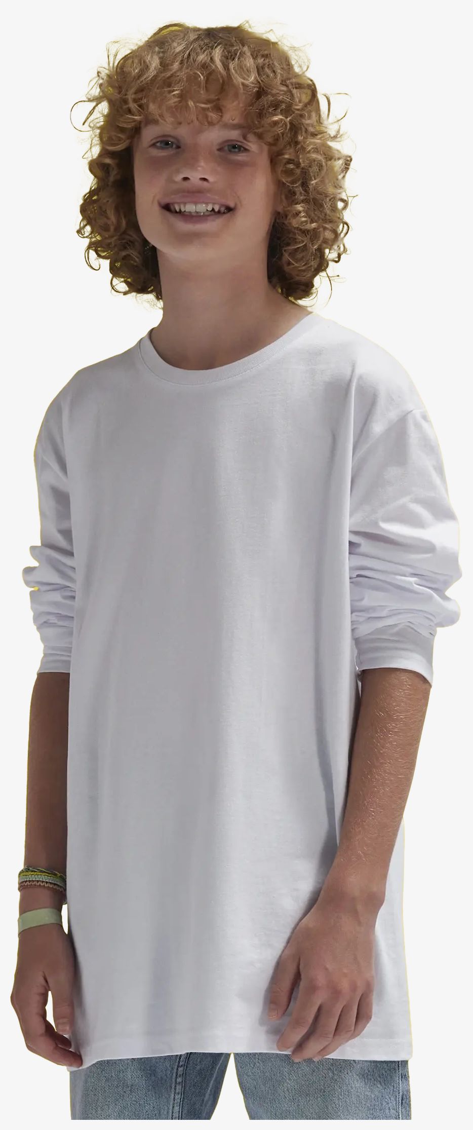 O Kids #E150 Long Sleeve 'e um tee-shirt de jersey simples, confec\u00e7\u00e3o tubular com gola fina e faixa de gola refor\u00e7ada. \u00c9 concebido sem etiqueta para maior conforto. A composi\u00e7\u00e3o \u00e9 100% algod\u00e3o ring-spun pr\u00e9-encolhido.