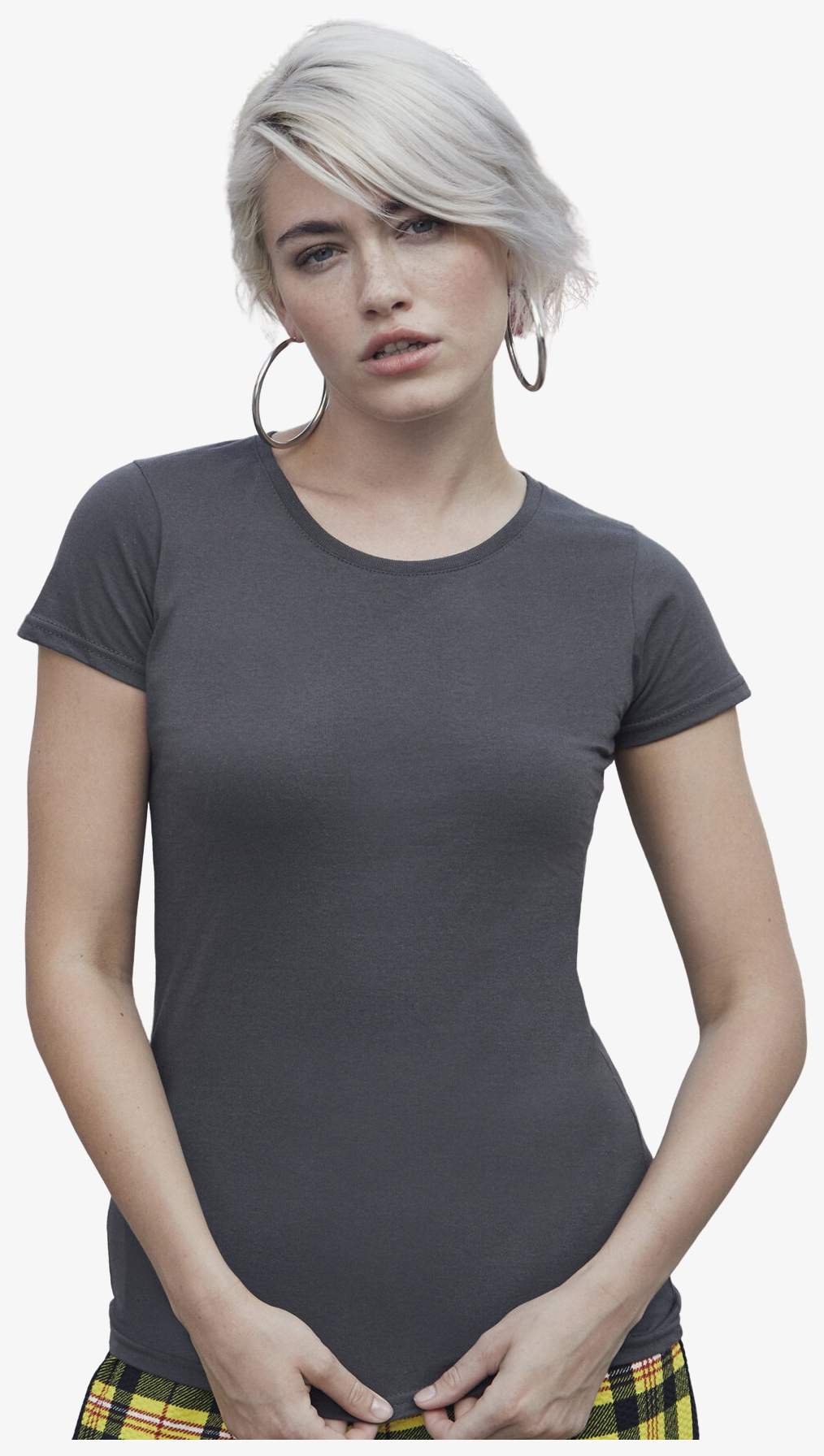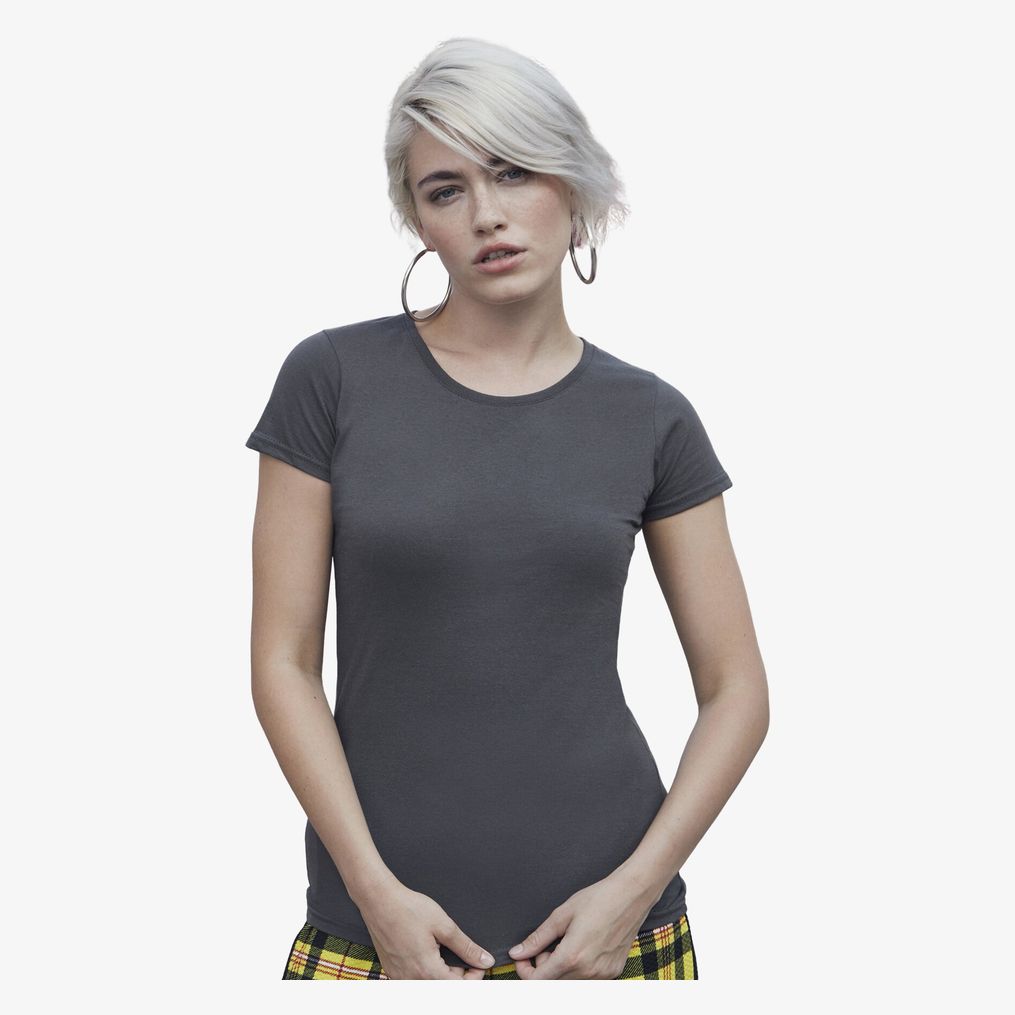 O tee-shirt Sofspun® T Lady-Fit é feito em algodão jersey simples, com uma versão Heather Grey composta por 97% algodão e 3% poliéster. Possui gola redonda em algodão/lycra® com costura simples e fita de acabamento. As mangas são do tipo set-in. O corte é ajustado com costuras laterais.