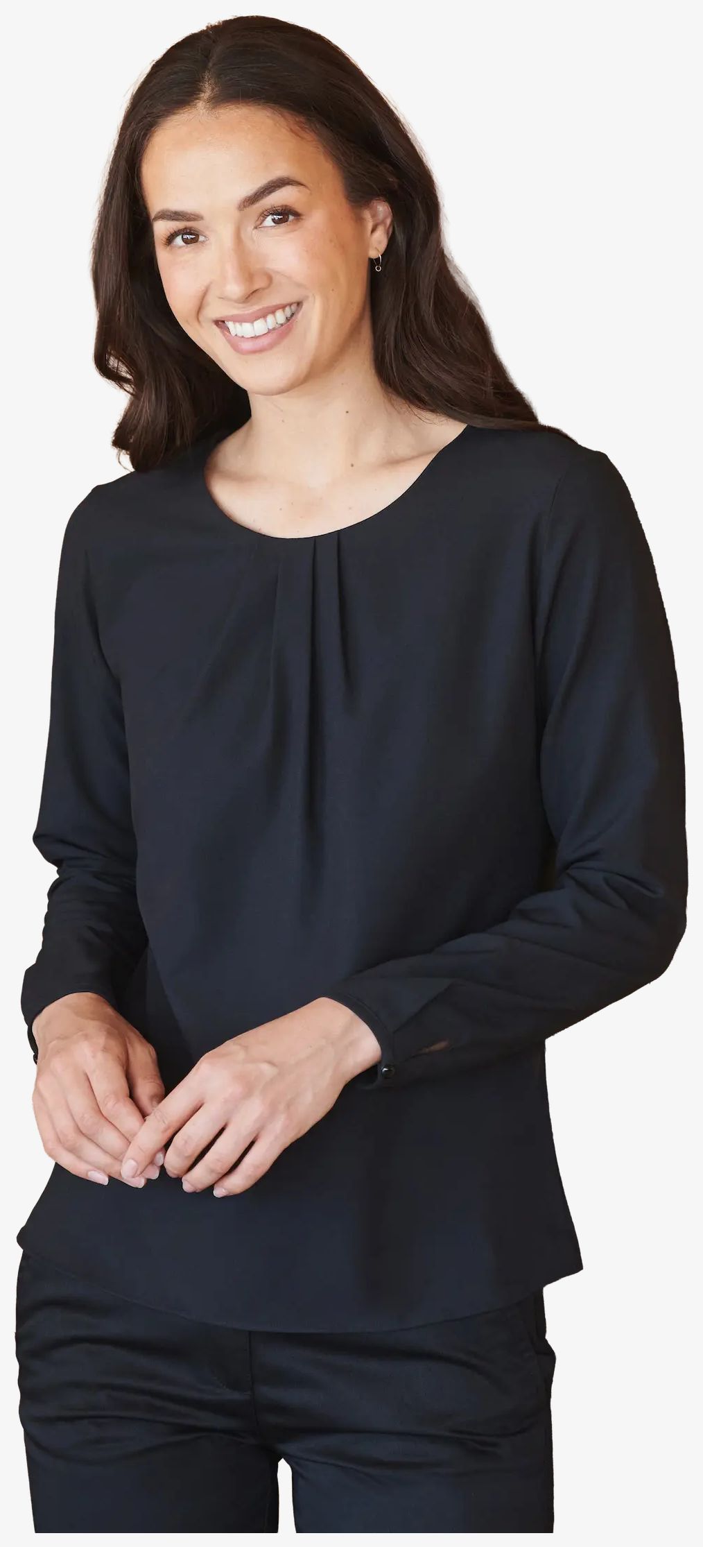 A blusa de mangas compridas para mulher tem pregas na frente e fecho por botão nas costas. A barra é arredondada. A composição é 100 % poliéster pufy®.