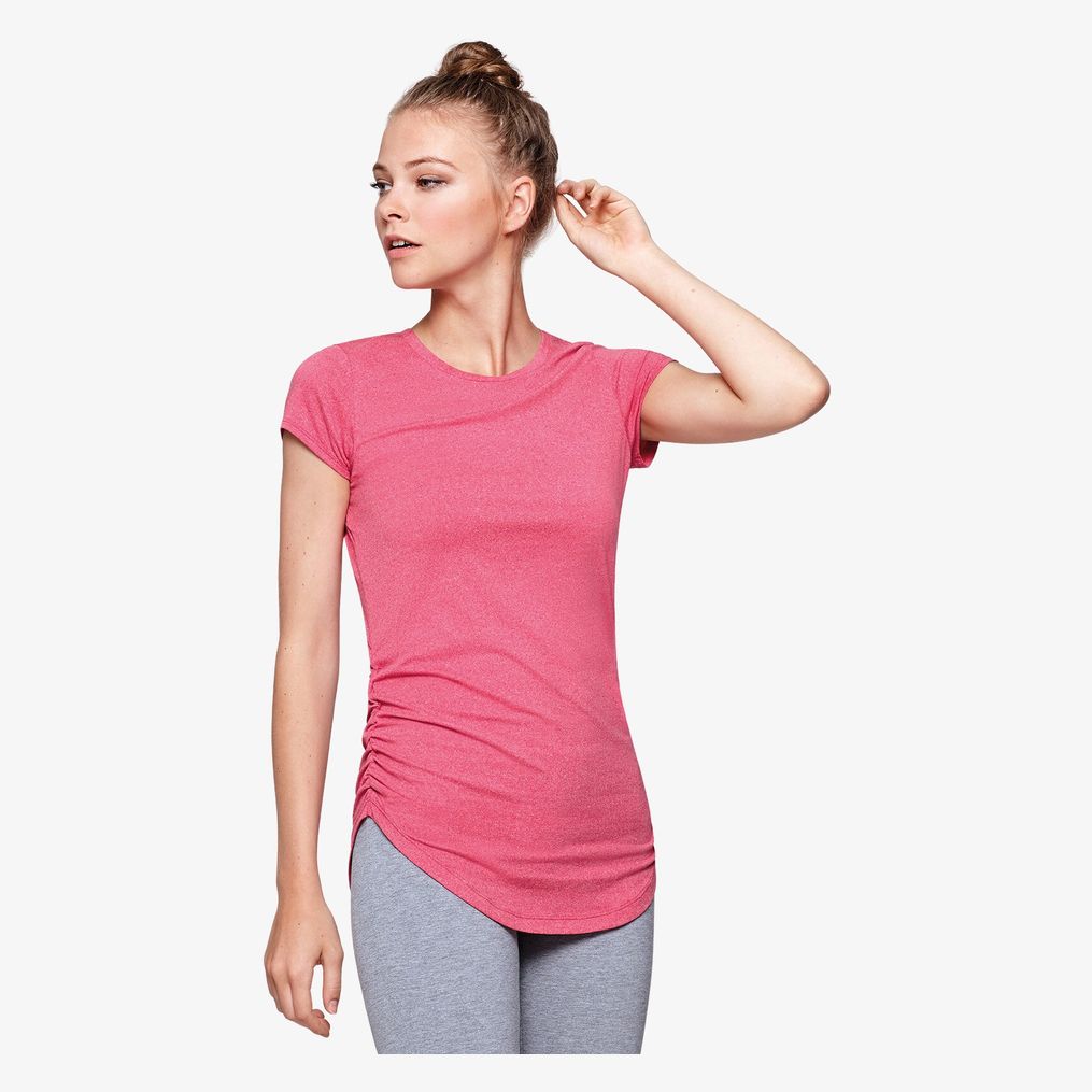 O tee-shirt técnico de manga curta multisport para mulher é fabricado com tecido de poliéster toque algodão e gola redonda no mesmo tecido. Inclui painéis laterais elásticos para melhor adaptação ao corpo e corte ajustado com comprimento específico. Modelo respirável com secagem fácil.