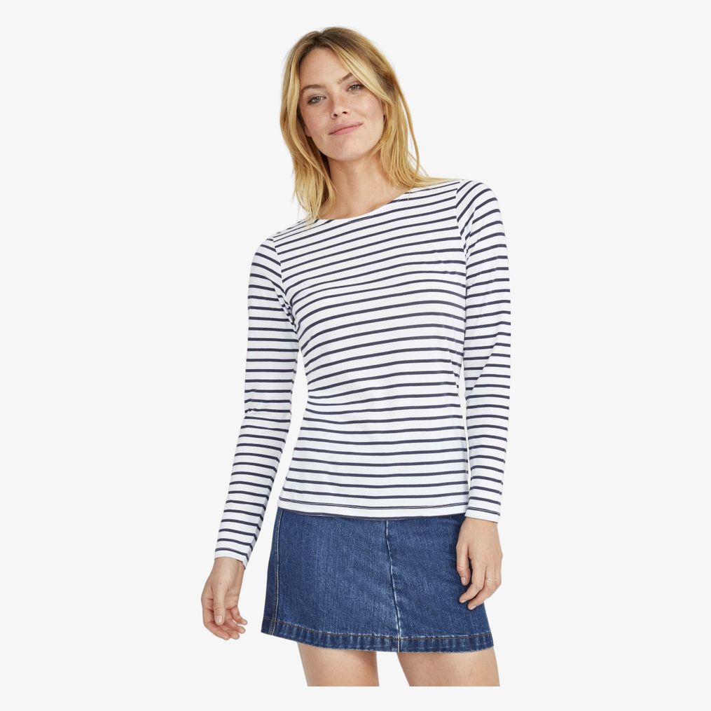 O Marine Women é um tee-shirt feminino com gola redonda e corte ajustado com corte costurado. Apresenta detalhes em chambray no interior da gola.