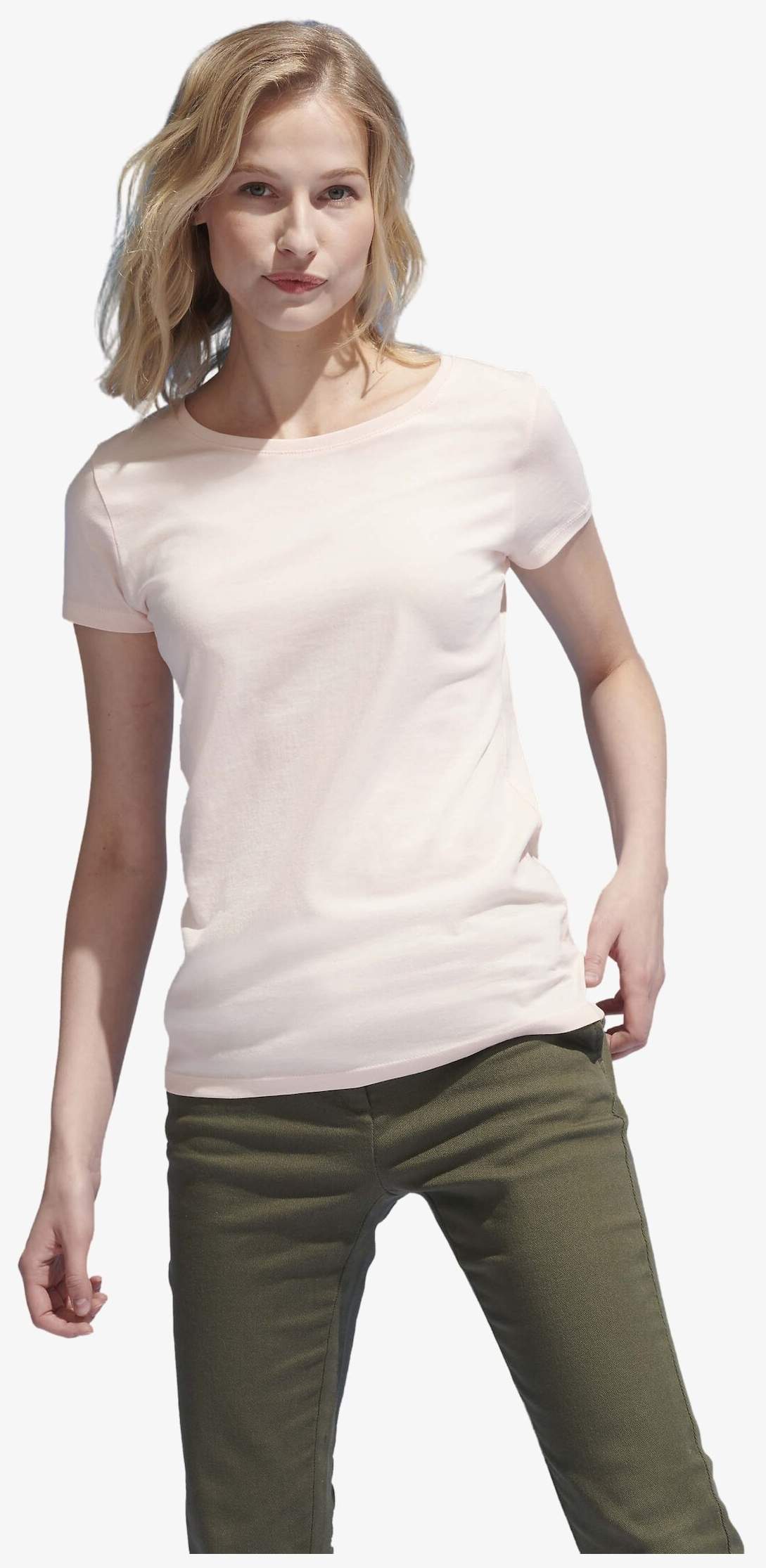 O tee-shirt feminino de manga curta é feito em jersey 100% algodão proveniente da agricultura orgânica com tratamento enzimático.