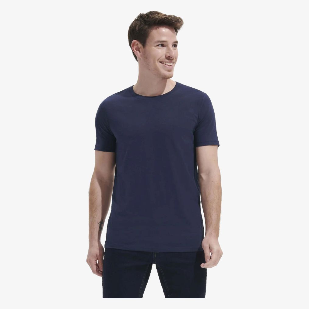 O tee-shirt masculino com decote redondo é confeccionado em jersey 190 composto por 95% algodão penteado semi Ringspun e 5% elastano. Inclui fita de reforço na gola e gola com canelado elastano. O corte é costurado e o tecido é stretch.