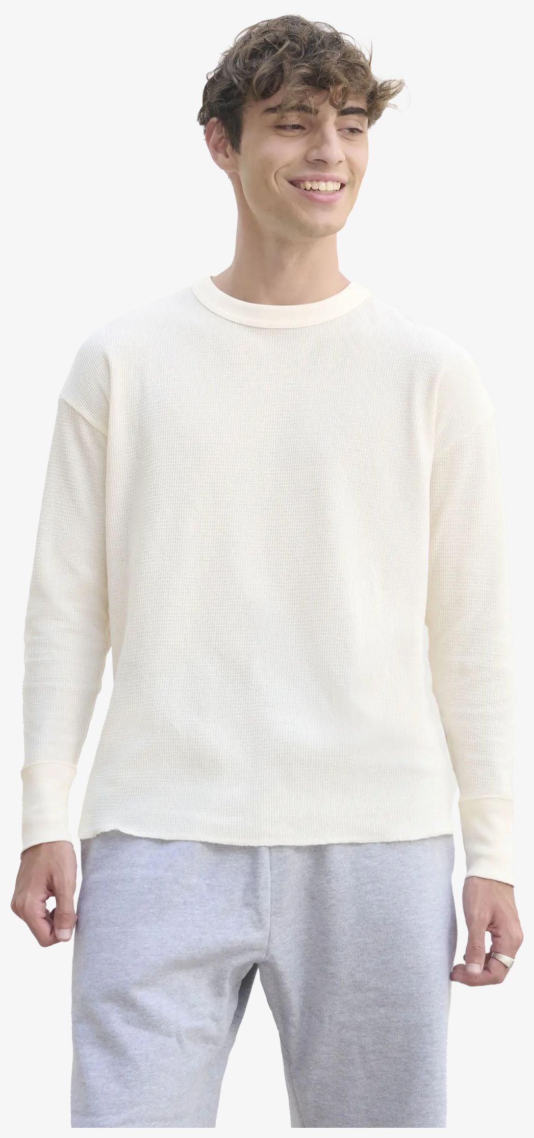 A camisa térmica gaufrada tem manga longa e acabamento em punho no decote e na barra. O corte é confortável para uso diário.