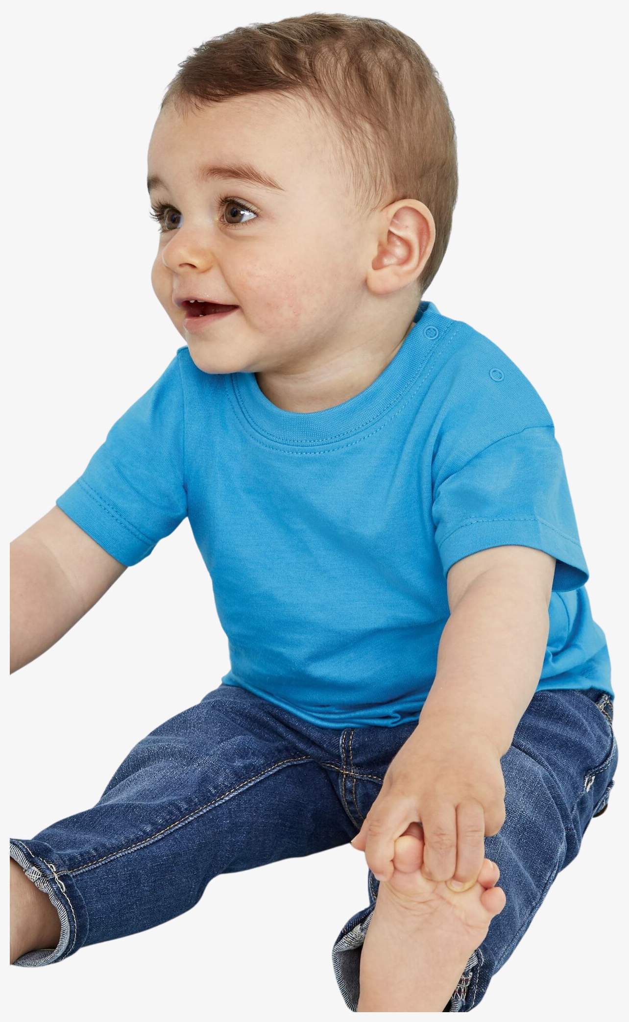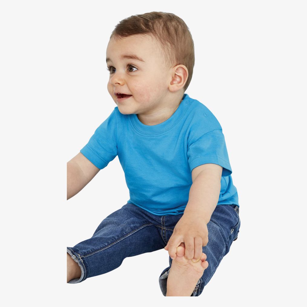 O tee-shirt bebé Mosquito em algodão penteado, com abertura no ombro esquerdo e dois botões de pressão tom sobre tom, adequado para vestir e para a troca.