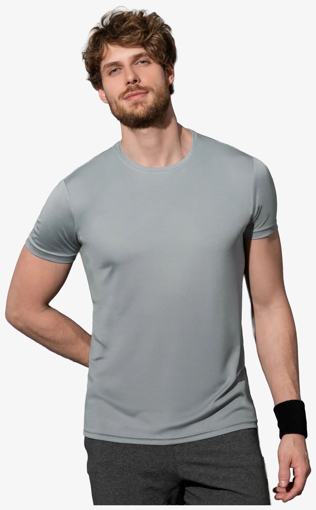 O tee-shirt desportivo masculino Sports-T com corte justo ao corpo, em malha interlock respirável e de secagem rápida. Costuras dos ombros flatlock decorativas, gola fina a condizer, fita de reforço, costuras laterais.\
