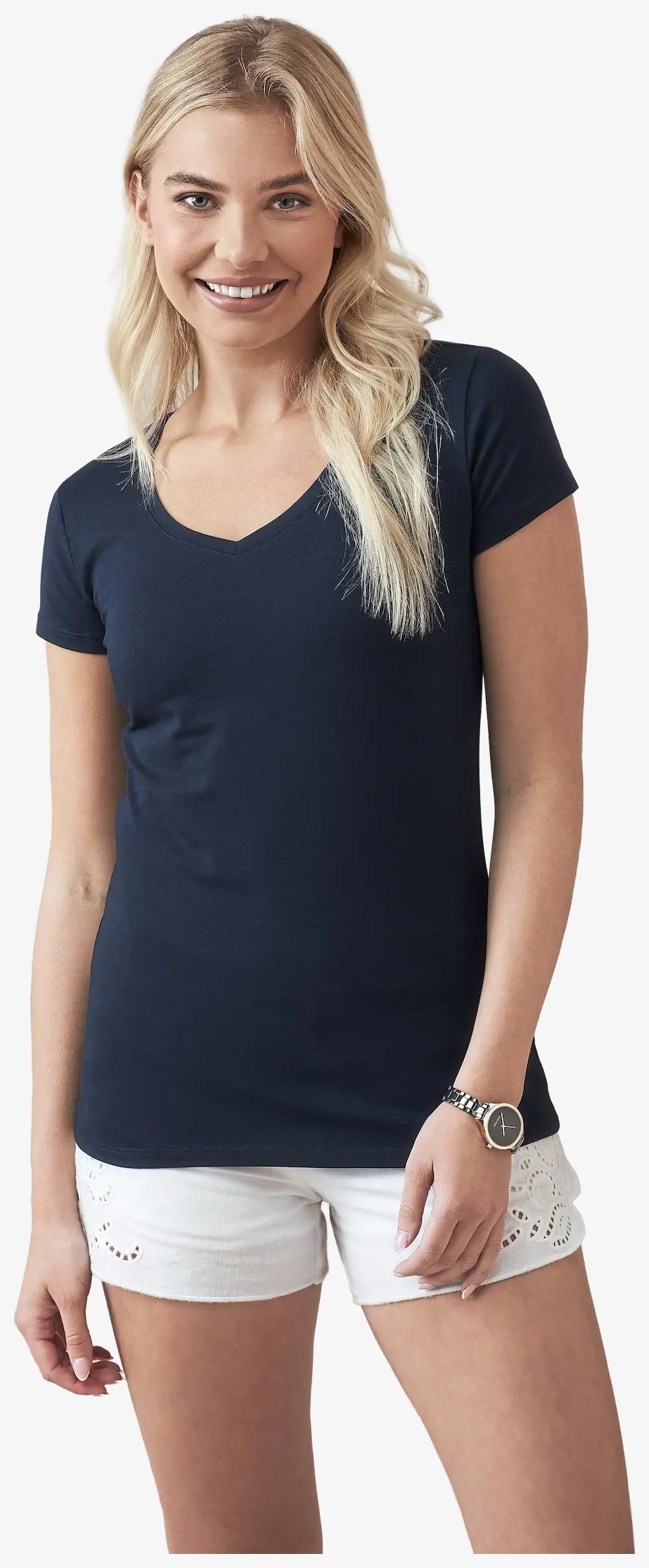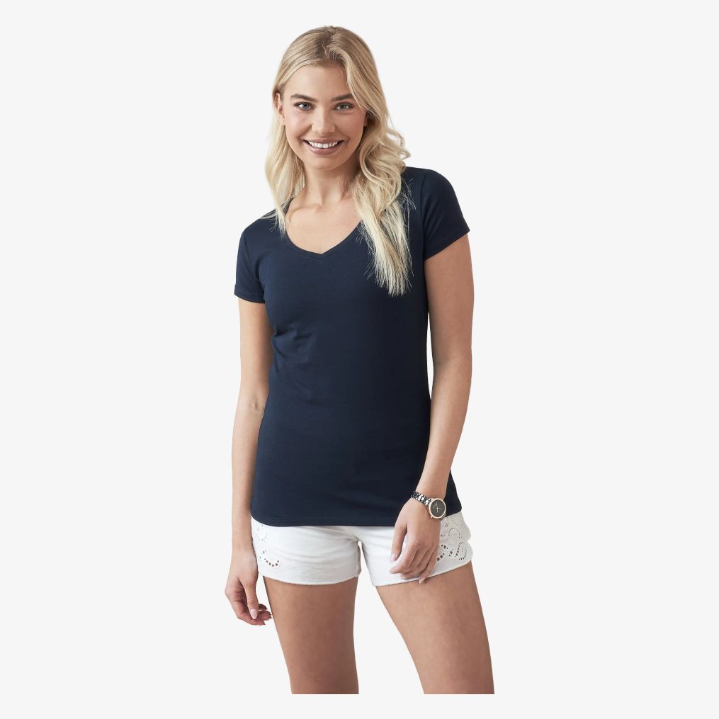 O Stretch-T V-Neck Women é um tee-shirt de mulher justo com gola em V, com decote amplo e comprimento moderno. Mistura de algodão e elastano. Fita de reforço contrastante, gola fina no mesmo material, costuras laterais, ombros reforçados.