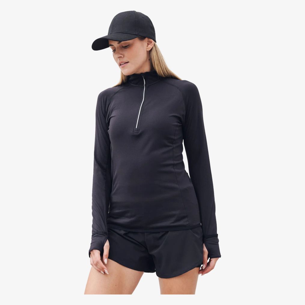 O Ladies' long sleeved 1/4 zip top \u00e9 um tee-shirt de mangas compridas destinado a uso desportivo. Inclui gola 1/4 zip reflexiva, mangas raglã e bolso para chave localizado nas costas. Etiqueta destacável e acesso para auriculares completam as suas funcionalidades.
