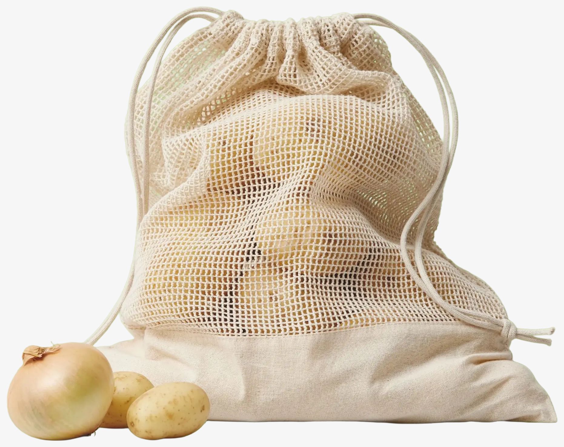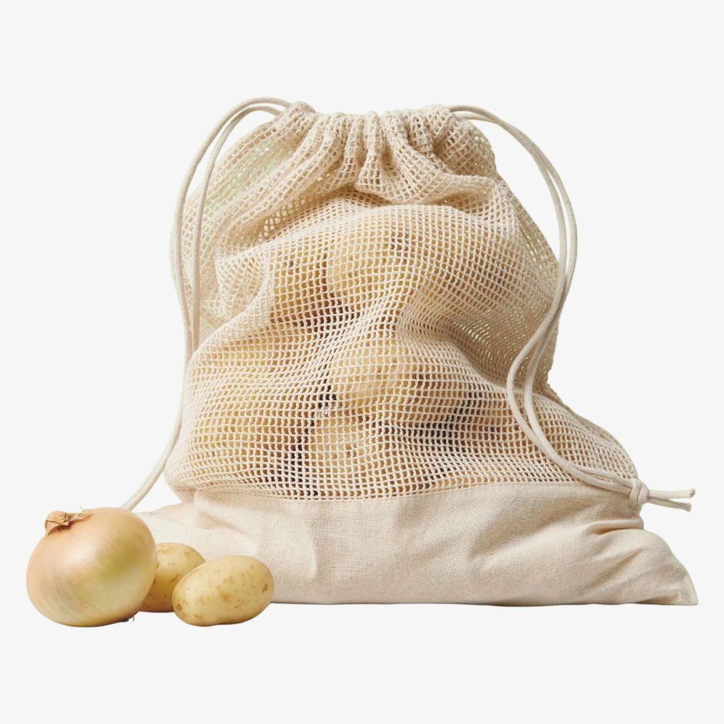 O sac filet coton é concebido com um cordão. Serve para transportar frutas, legumes, acessórios ou sapatos. Sua estrutura em algodão reciclado favorece a circulação de ar para preservar a frescura do conteúdo.