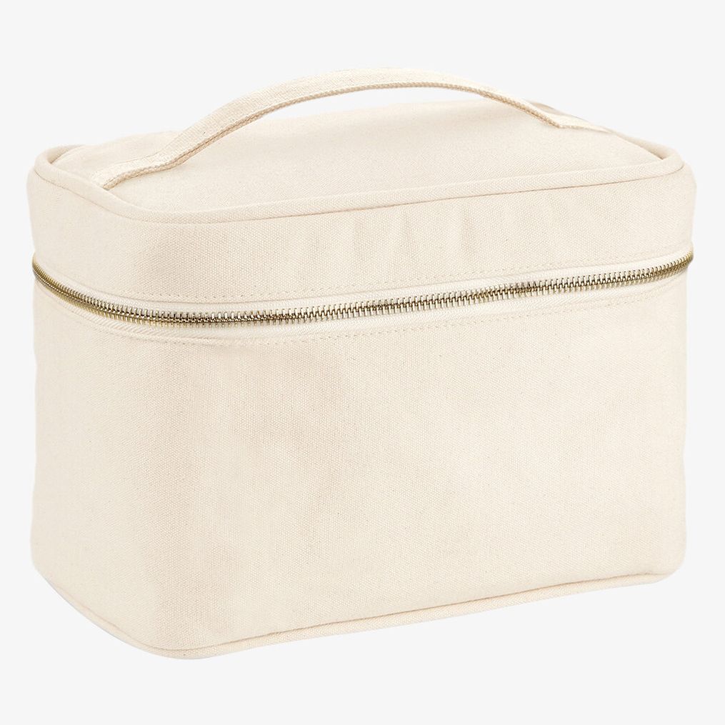 A trousse toilette toile de algodão inclui uma alça de transporte, um forro de algodão e um fecho de correr. Adequada para uso múltiplo com capacidade de 5 litros.