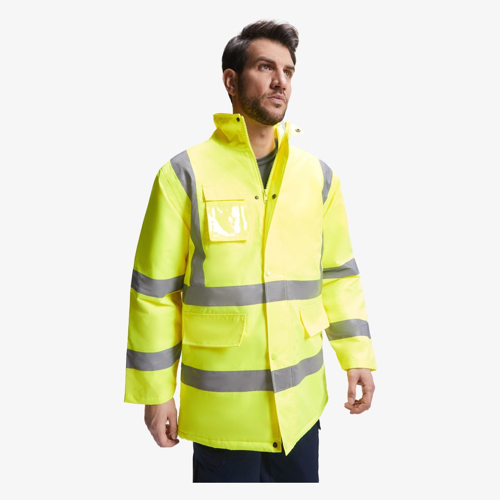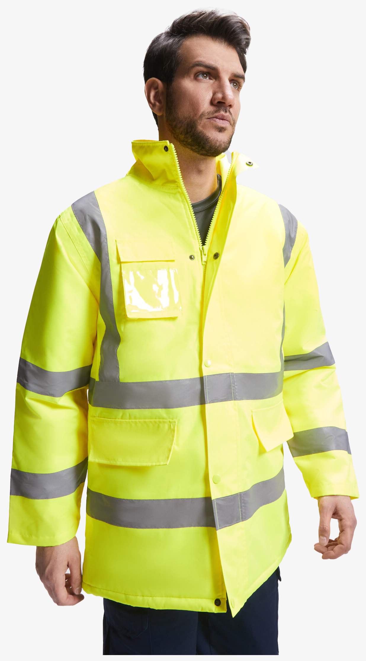 O colete de segurança Merak é uma jaqueta com isolamento combinada de alta visibilidade projetada para proteção adequada em ambiente profissional. Possui tecido impermeável com costuras termossoldadas e faixas de alta visibilidade no peito, mangas e ombros. O capuz dobrável é ajustável por cordão. Vários bolsos estão integrados para armazenamento, incluindo um bolso no peito com aba e um bolso interno com zíper.