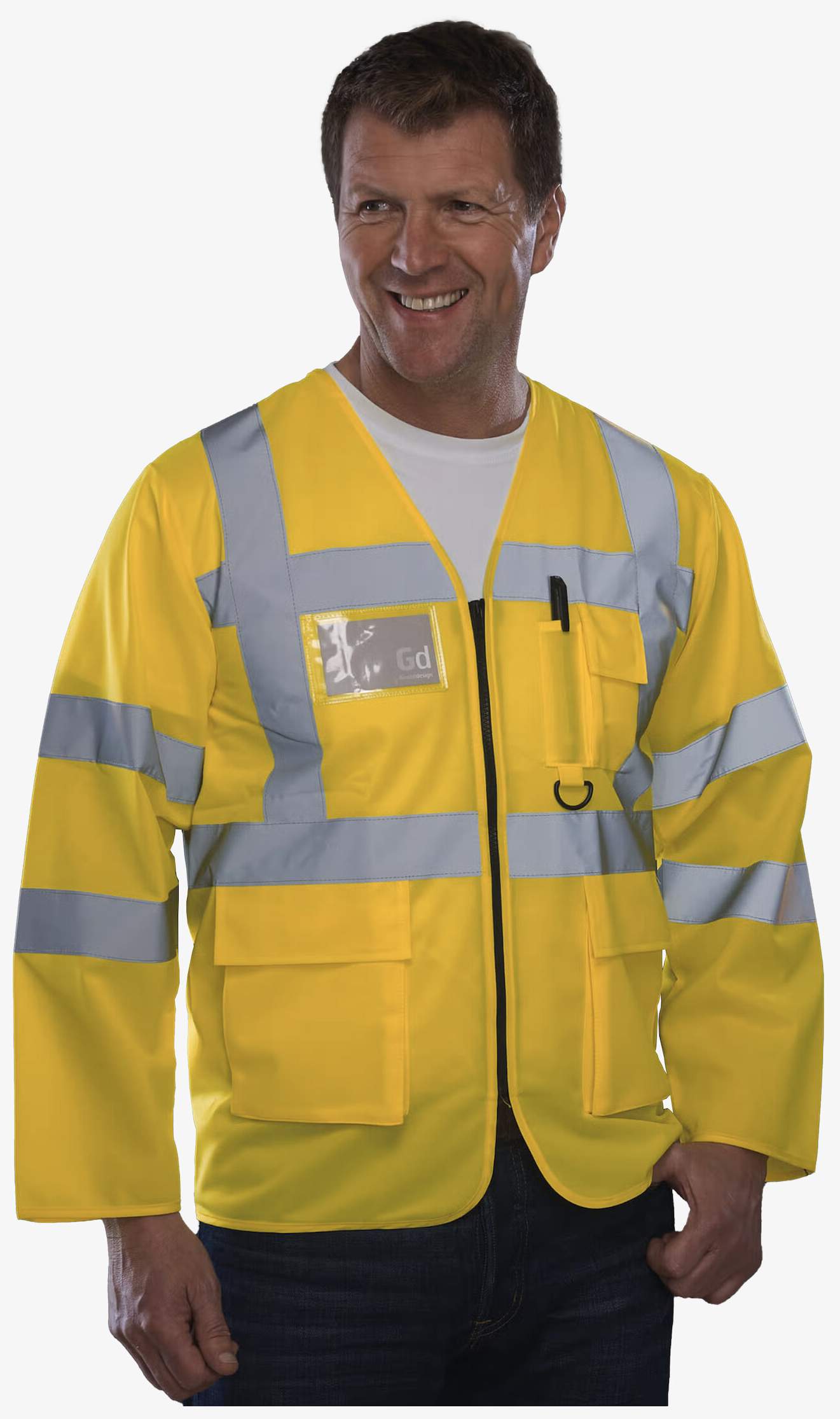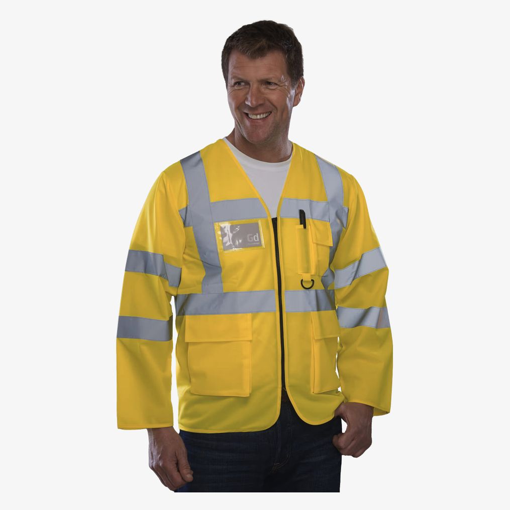 A veste alta visibilidade está equipada com bandas reflexivas de 3,5 cm em volta do corpo, dos braços e em cada ombro. Possui um bolso para telemóvel ou walkie-talkie no peito esquerdo, fecho de correr completo à frente, dois bolsos inferiores com abas acessíveis por cima nas laterais, bolsos para canetas e porta-chaves, bem como um bolso de identificação no peito direito.