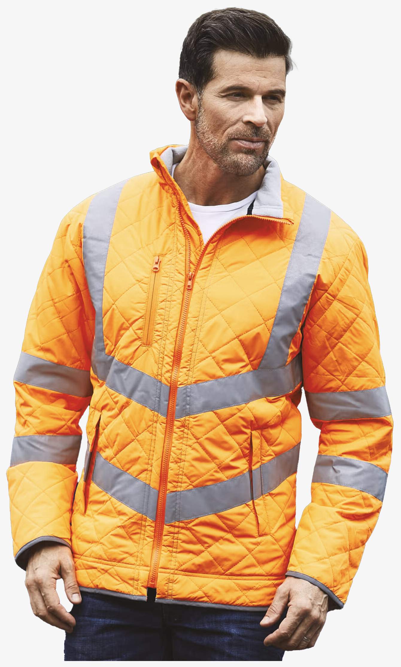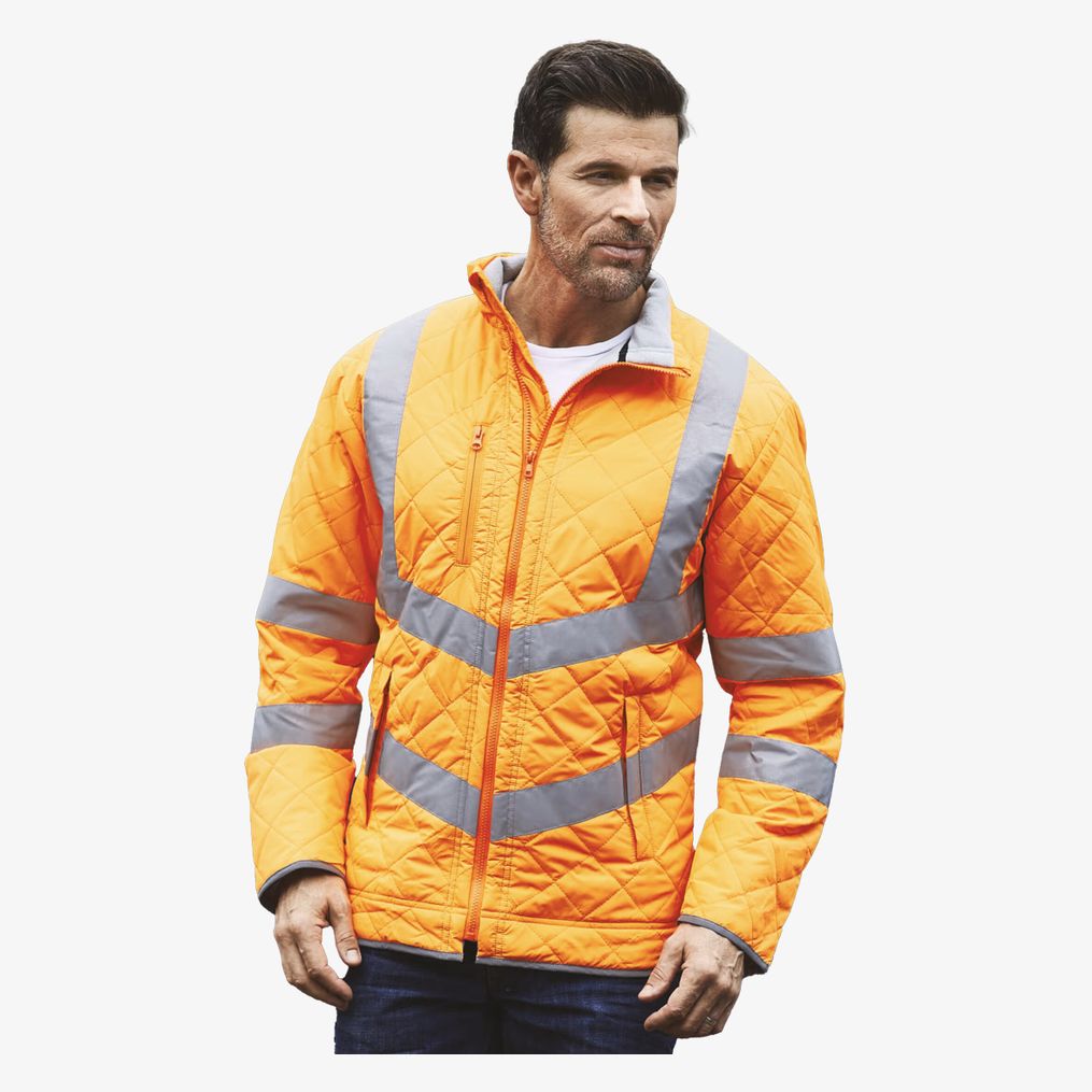 O colete de alta visibilidade possui um exterior repelente à água 100% poliéster e um forro acolchoado polar 100% poliéster. Integra duas faixas refletoras em forma de V no corpo e braços para aumentar a visibilidade. O colarinho alto inclui proteção para o queixo integrada. Tem um bolso de peito com zíper, dois bolsos laterais aquecedores para as mãos com zíper, um bolso embutido no forro polar e vivos refletivos na parte inferior das mangas.