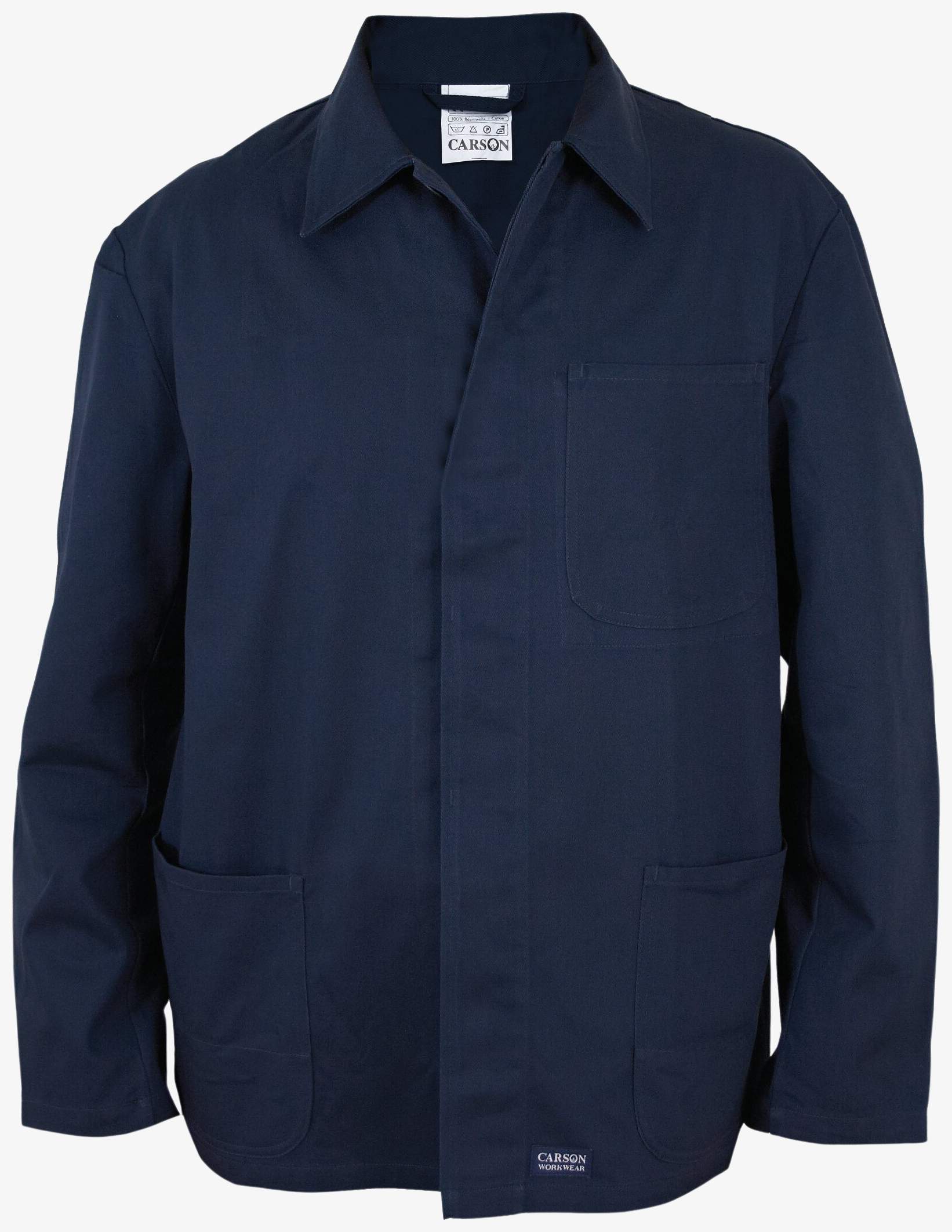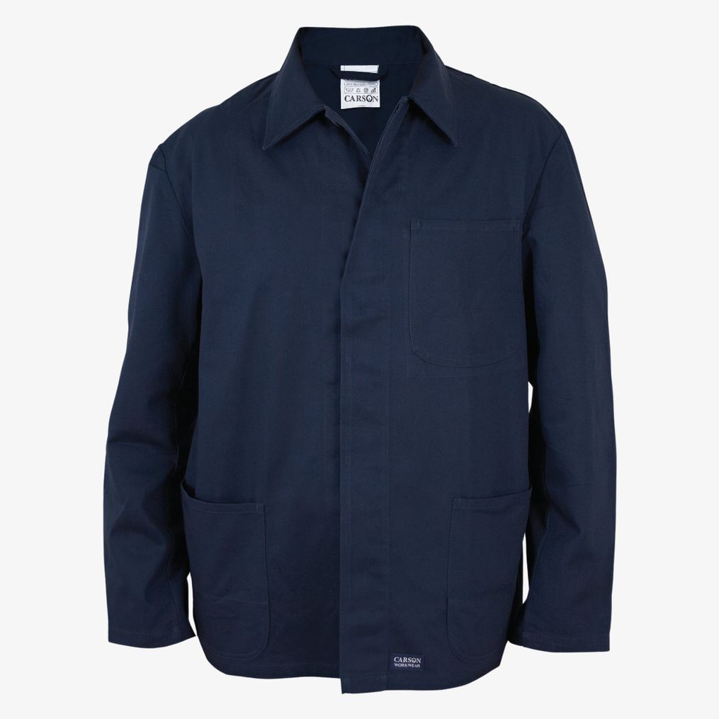 Classic Long Work Jacket är en lång jacka tillverkad i 100% bomull. Den är förkrympt och tvättbar i 60 grader. Hällen har en täckt knapp och den självhäftande baksidan är sömlös.