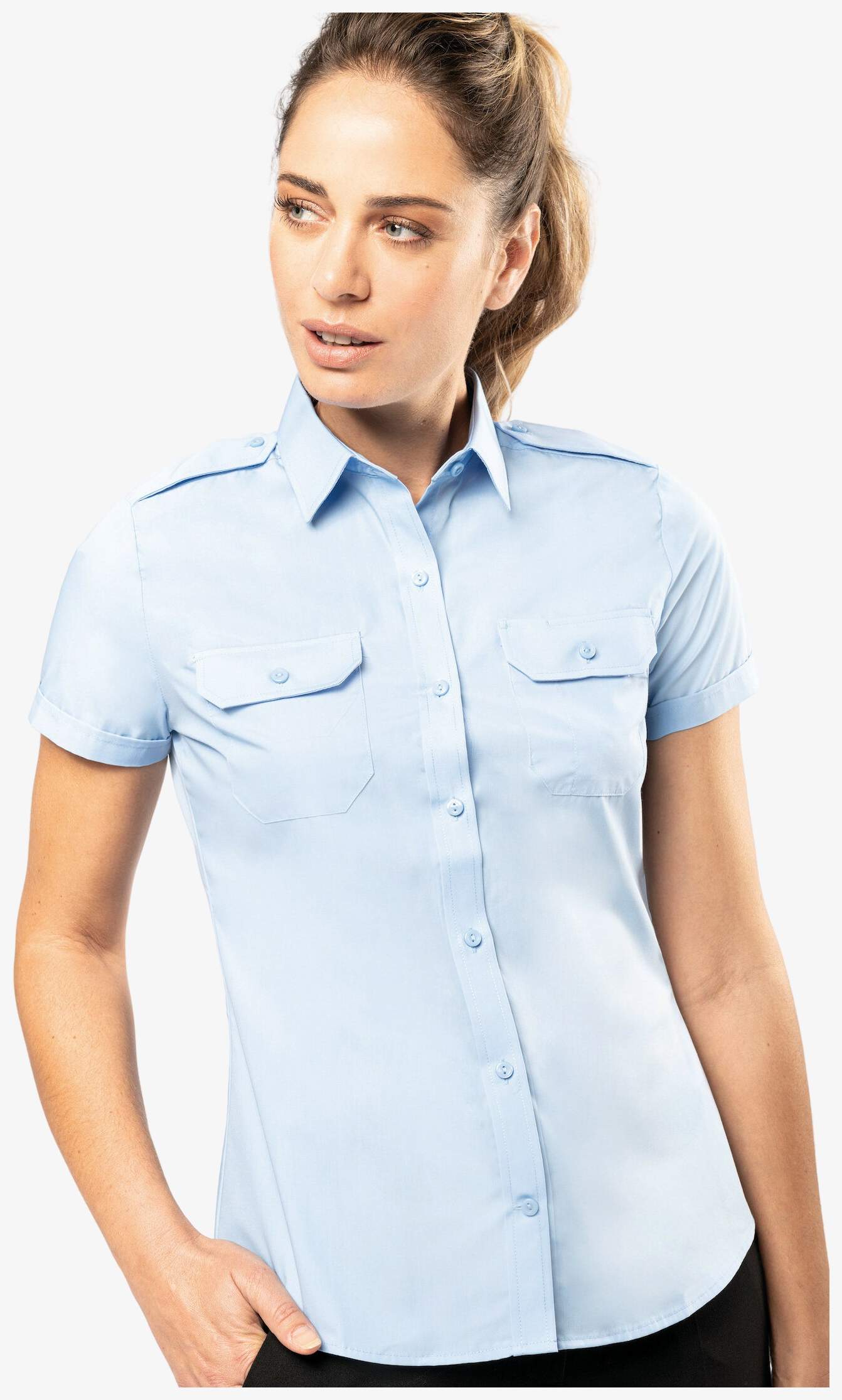 Kortärmad pilottröja för dam är tillverkad i poplintyg 65% polyester och 35% bomull. Den har två bröstfickor med klaff, varav en med pennfack på hjärtsidan, samt knappar ton i ton. En knäppbar klaff på axlarna möjliggör fastsättning av galoner. Avslutningen består av vikta ärmslut.