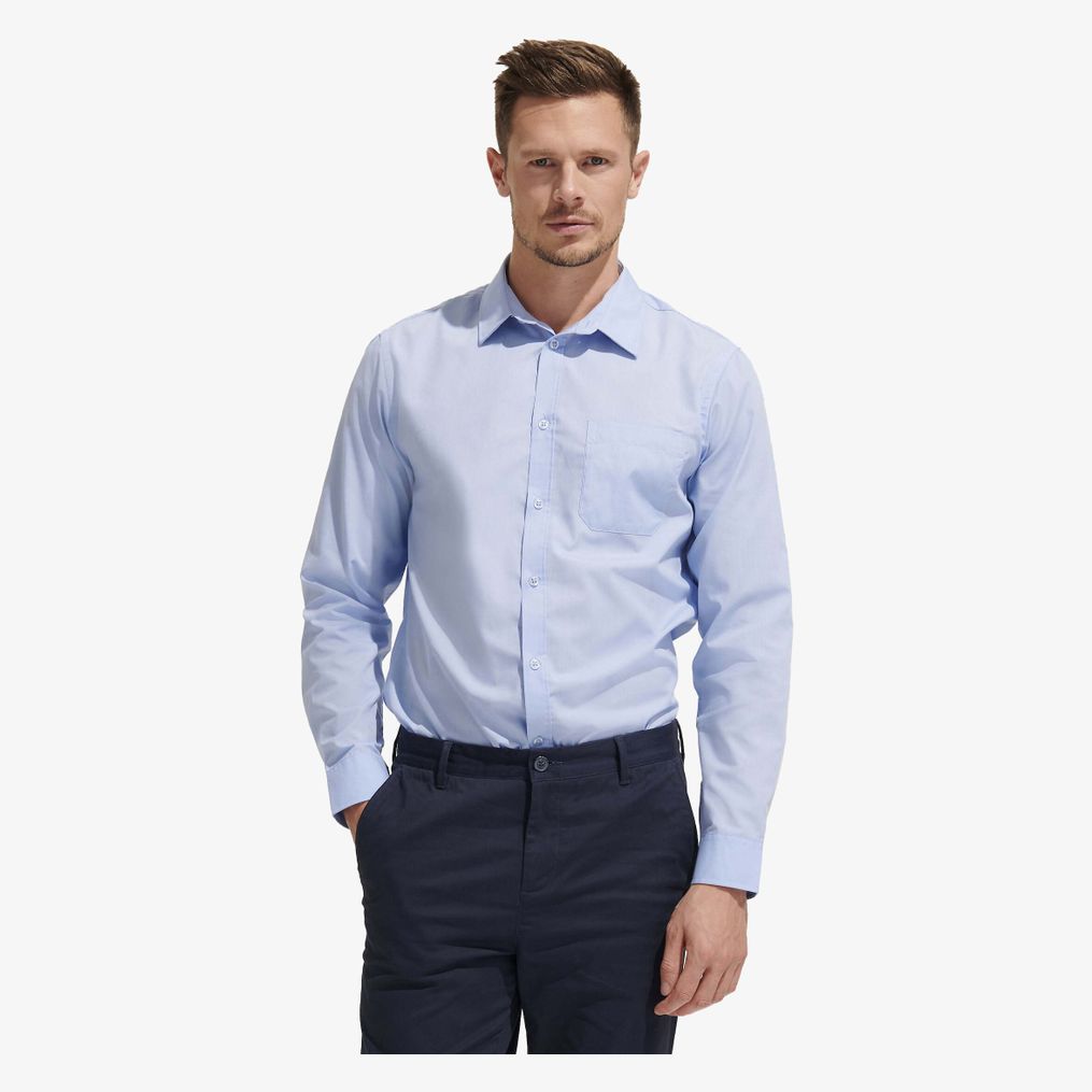 Baltimore Fit långärmad skjorta är tillverkad i polycotton poplin bestående av 65% polyester och 35% bomull. Den har en förstärkt klassisk krage och avtagbara stay. En bröstficka och en ton-i-ton 7-knappars knappslå kompletterar dess egenskaper. Manschetterna har 2 justerbara knappar och en smal knappslå.