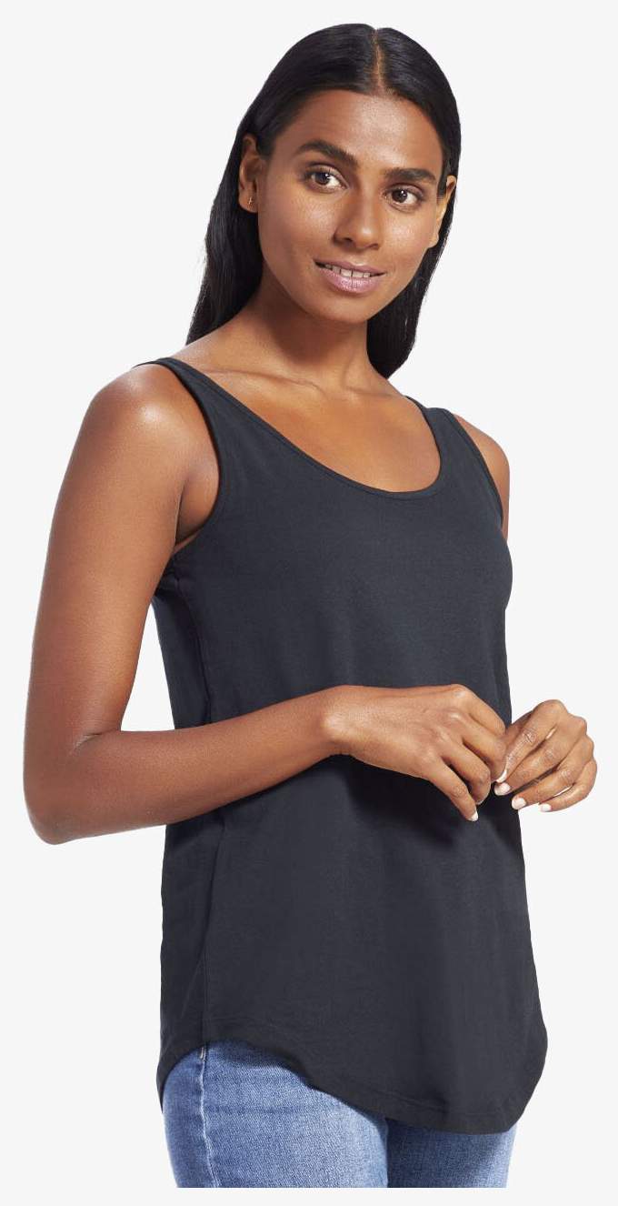 Den enfärgade tanktopen för kvinnor är gjord av ekologisk bomull eller i konvertering, ringspunnen och kammad med enkel jersey. Den har rund halsringning, figursydd skärning, rundad nederkant och smala armhål. Sömmarna är dubbla och den avtagbara etiketten är placerad i nacken.