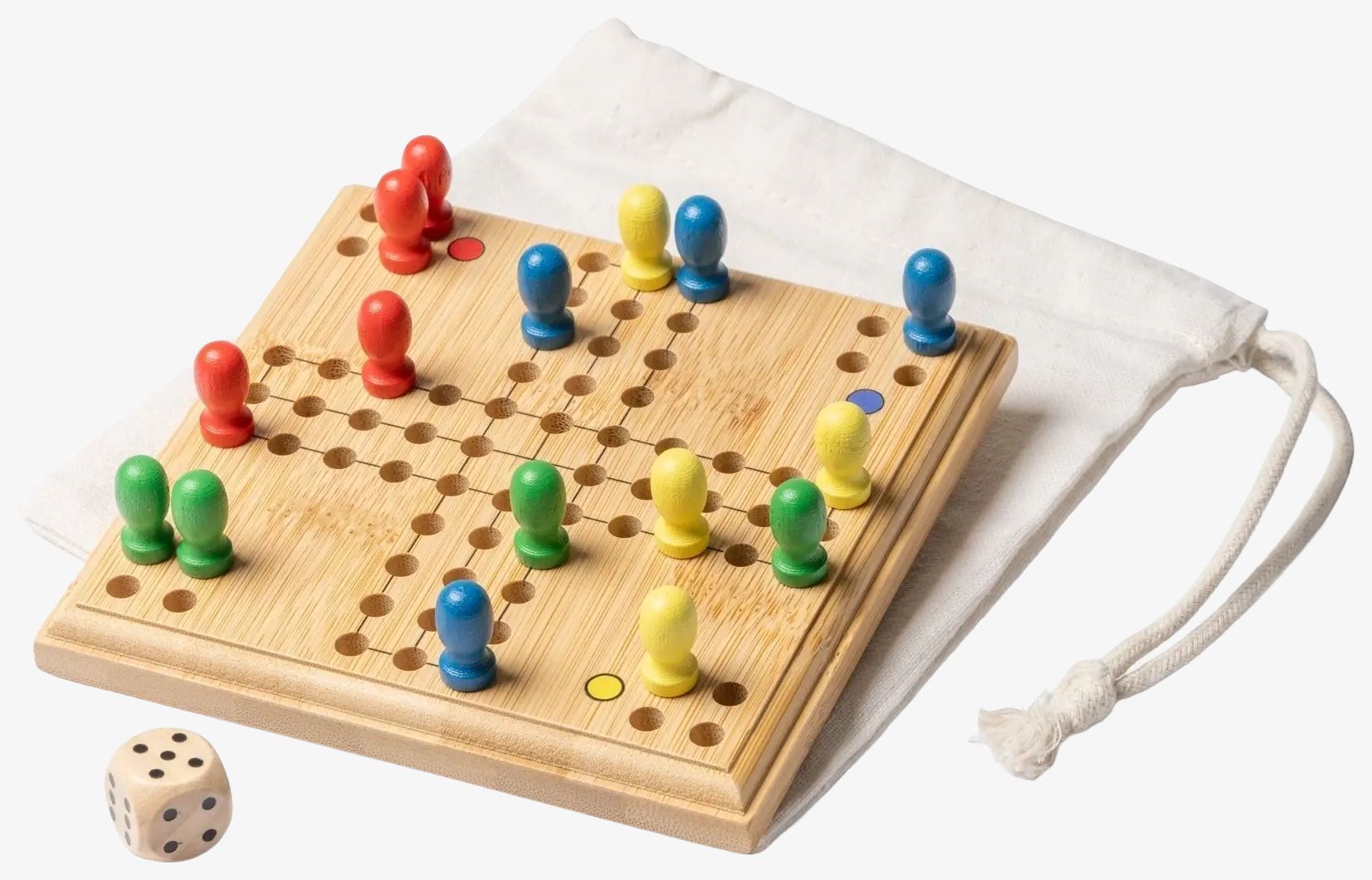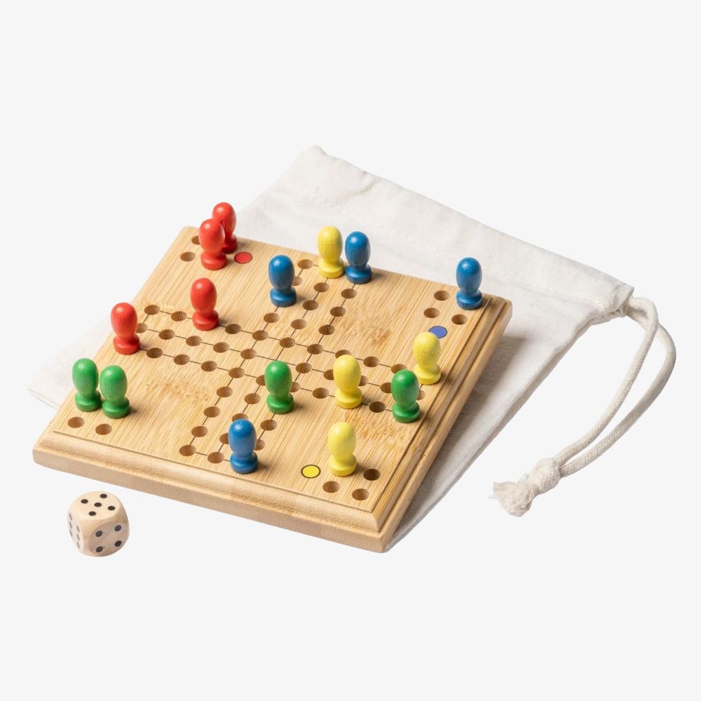 Parcheesi bambusspel innehåller en spelbräda, en tärning, 16 pjäser uppdelade i 4 färger samt ett bomullsöverdrag. Lådan är designad enligt principer för miljövänlig design.