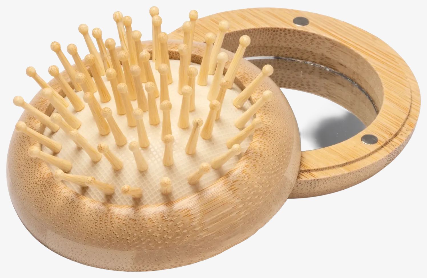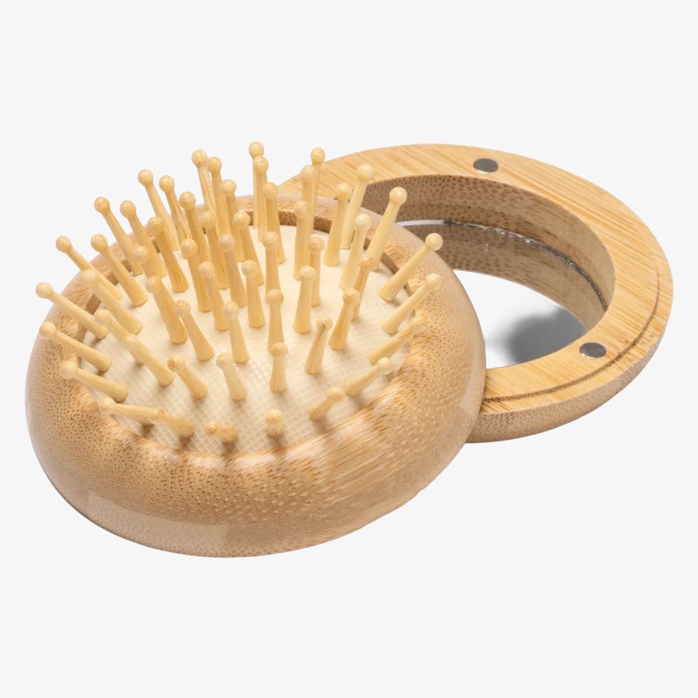 Den vikbara borsten SELDON har en kropp i bambu med integrerade borst och en spegel på baksidan. Den är avsedd för användning under resor med hänsyn till miljön.