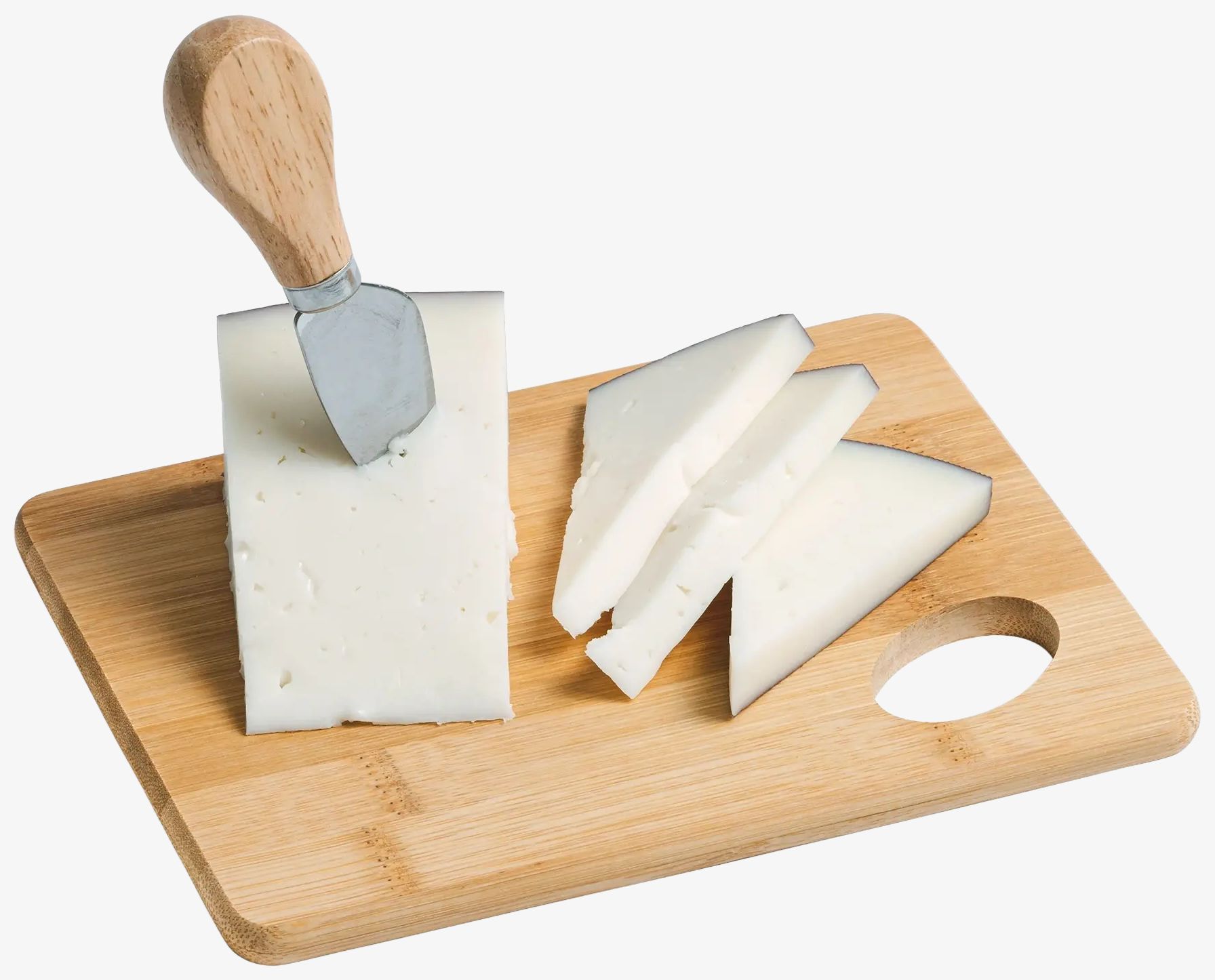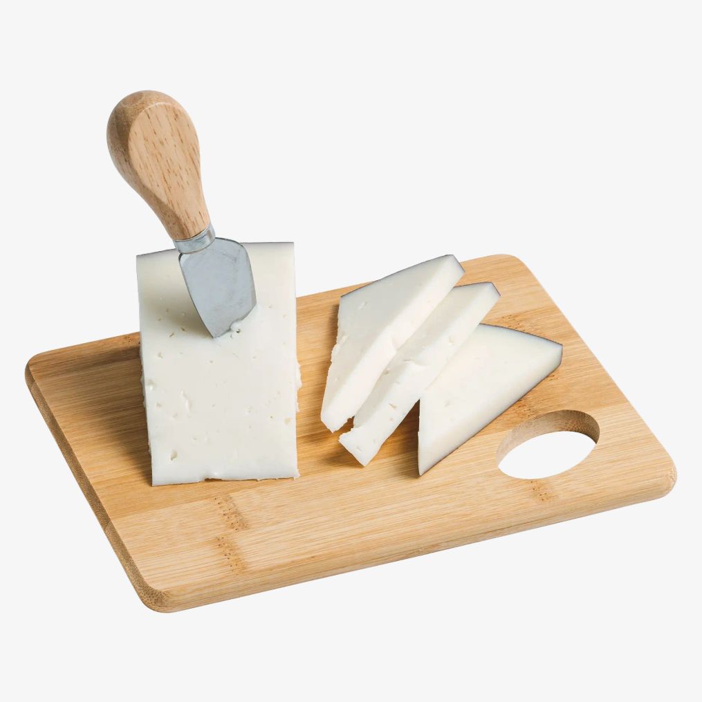Skärbrädan i naturlig bambu underlättar skärning och hantering av mat. Dess form inkluderar en plats för upphängning och ett bekvämt grepp.