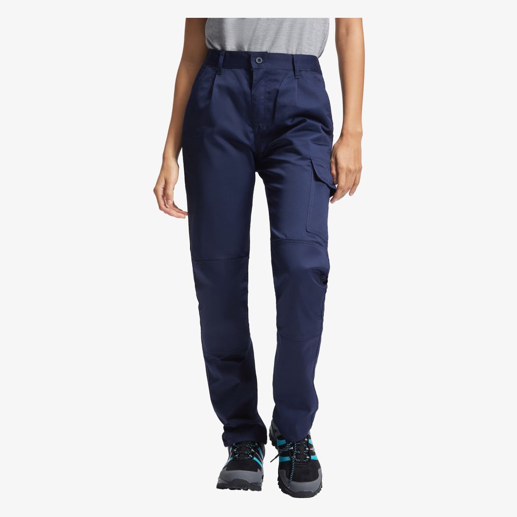 Daily Woman arbetsbyxor med resår i ryggen och flera funktionella fickor, inklusive sidofickor samt bakfickor med lock och kardborreknäppning.