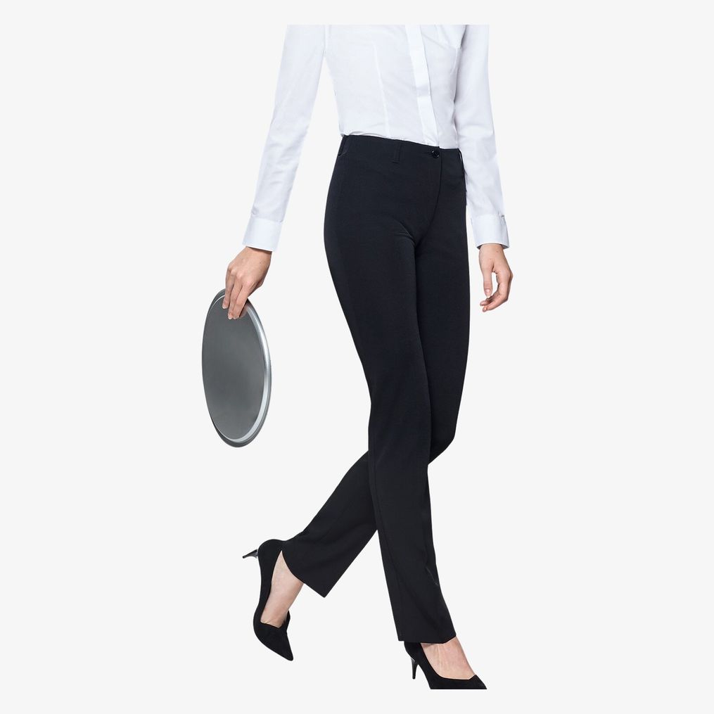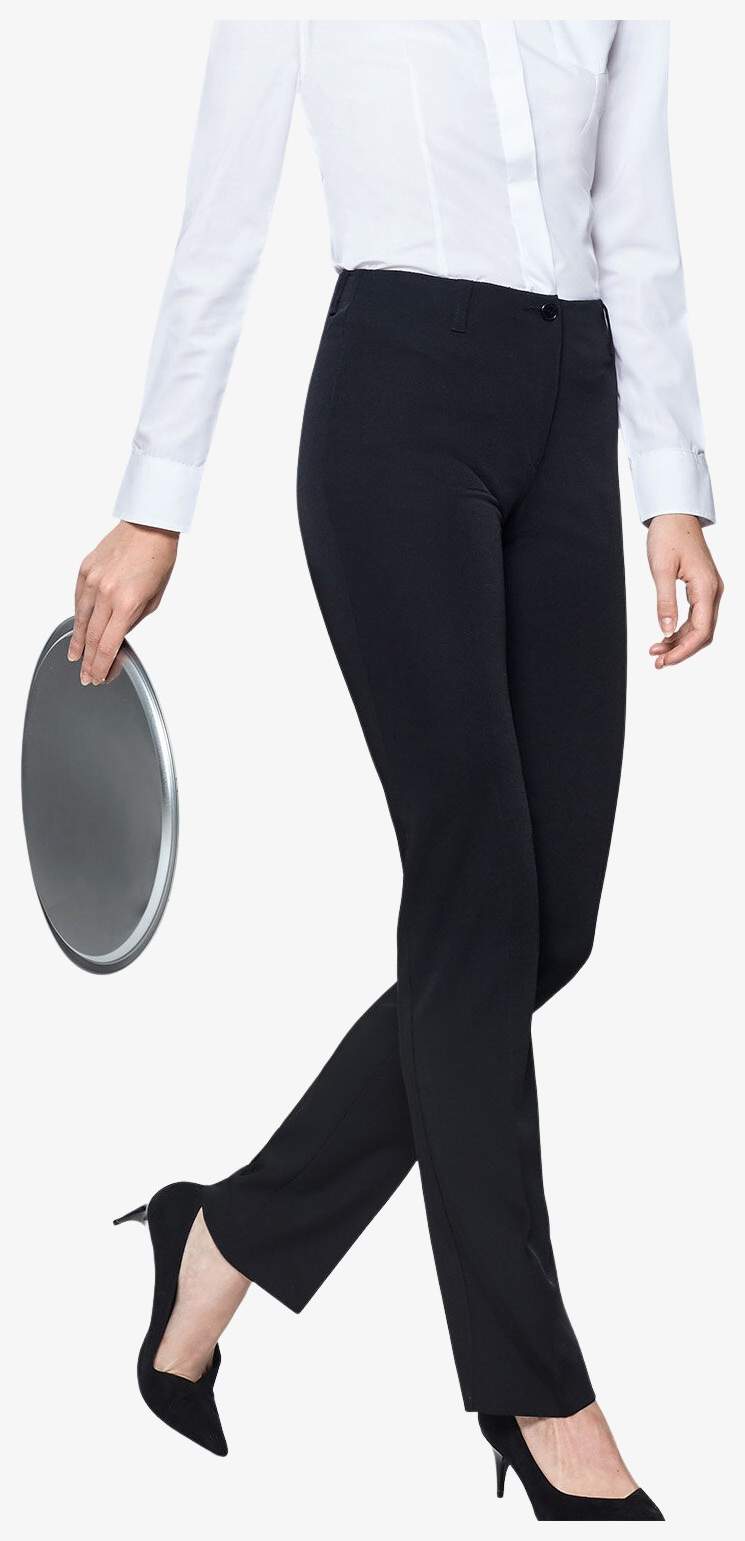 Byxan Waitress är avsedd för kvinnligt arbete, anpassad för professionella miljöer som kräver praktiskhet och organisation. Den har två framåtvikt, en höger framficka för plånbok, sidofickor och en höger bakficka med knapp. Fem bälteshällor möjliggör tillägg av tillbehör.