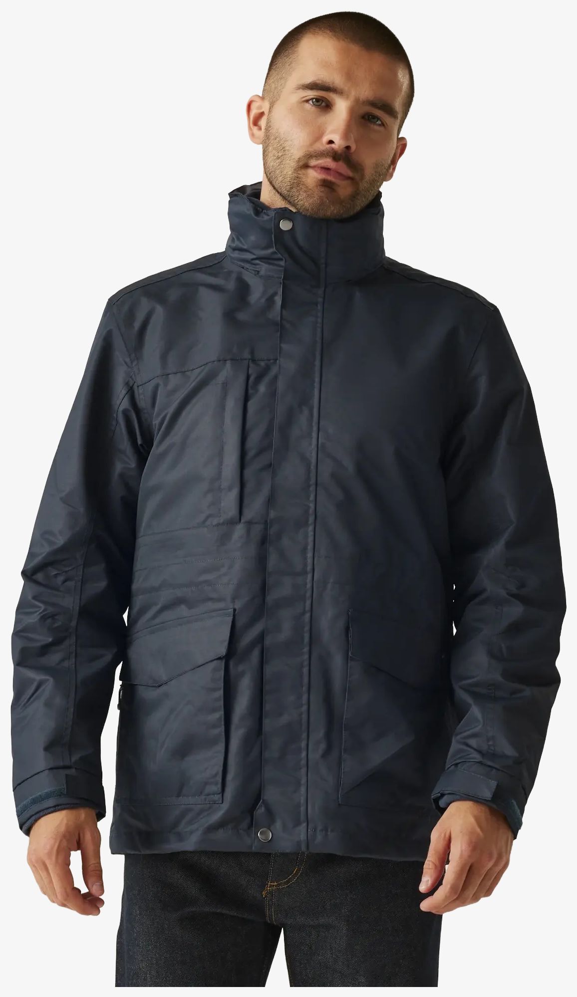 The Benson III 3-in-1 jacket is a men's jacket designed with multiple zipped pockets and adjustable cuffs. It features a waist adjustment cable and a hidden zip inlet in the lining.