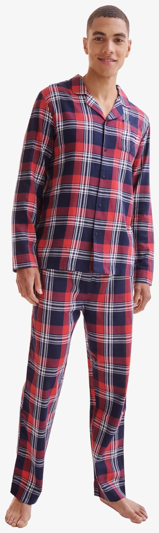 Men's tartan lounge set är ett avslappnat set för herrar bestående av två delar. Den lediga skjortan har knappar och en påsydd ficka med söm på bröstet. De avslappnade byxorna har helt elastisk midja och en enkel fåll. Manschetterna är försedda med dubbel söm i samma tyg. Etiketten är avtagbar.\n\n- 100% bomull\n- 2-delars set\n- Byxmidja elastisk\n- Påsydd ficka på skjorta Vikt : 115g/m²